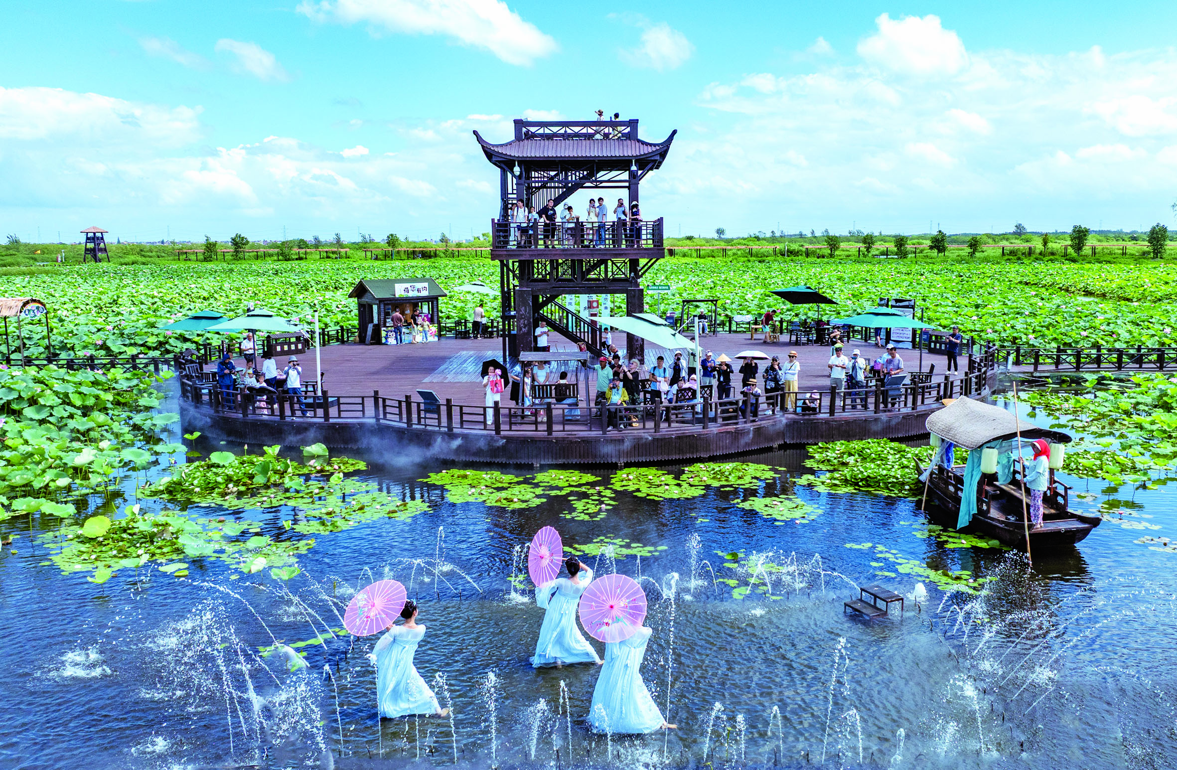 7月26日,游客在江苏省兴化市万亩荷塘景区观看表演。 近日,全国多地持续高温,催热暑期“清凉游”,亲水项目、夜游等多样化消暑体验和消费场景释放夏日经济活力。 新华社发