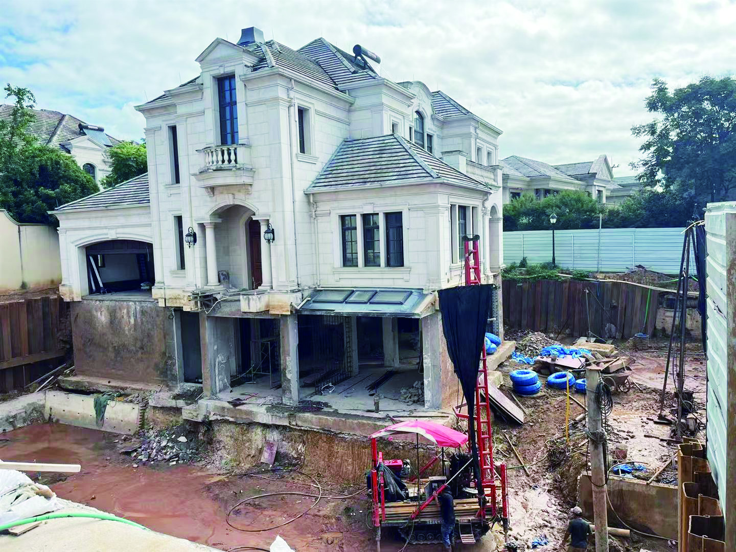 该别墅位于小区东区的“御玺台”7幢,是独栋别墅。小区东区为纯别墅区,有40多幢别墅。7月23日,记者进入该小区,发现有多户别墅正在装修,与7幢相邻的8幢也在装修,基础工程已进入尾声。据8幢的装修工人说,前两天下雨,7幢开挖的地下室西侧与8幢庭院相邻部位的挡墙倒塌,这些天7幢的工人正在抓紧加固。