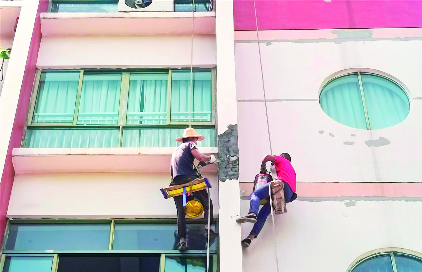 记者 李建林 文/摄 7月28日,金华市机关幼儿园?的外墙开始修缮。暑假是提升校园环境、改善教育设施设备的黄金期。近期,我市不少学校开始对教室和办公室、学生宿舍楼、食堂厨房及就餐区进行修缮和设施设备更新,并进行校园绿化维护等。