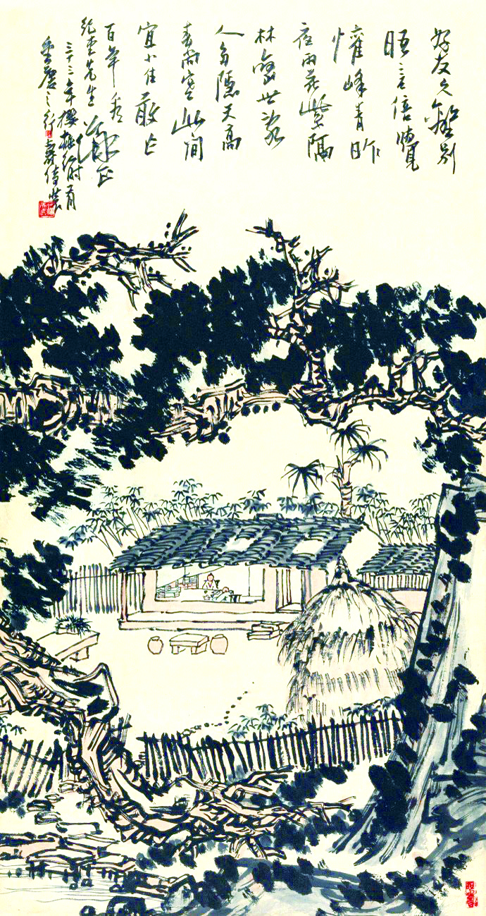 深山密林之中,有一处围着篱笆的小院,两间小屋白墙黛瓦,一派恬静舒适的田园风光。这是潘天寿《山庄晤旧图》中描绘的风光。“好友久离别,晤言倍觉欢。峰青昨夜雨,花紫隔林峦。世乱人多隐,天高春尚寒。此间宜小住,敢作百年看。纪堂先生诲正。三十三年樱桃红时,有重庆之行,寿倚装。”临行之前,潘天寿以此画作为礼物,赠送给校长杜佐周。2013年,在中国嘉德拍卖会上,这幅画的成交价为1610万元。“在小顺,潘天寿创作了一批画作,‘小瑞春楼’是潘天寿在小顺时的斋名。”云和县政协文化文史和学习委员会副主任魏世荣说。