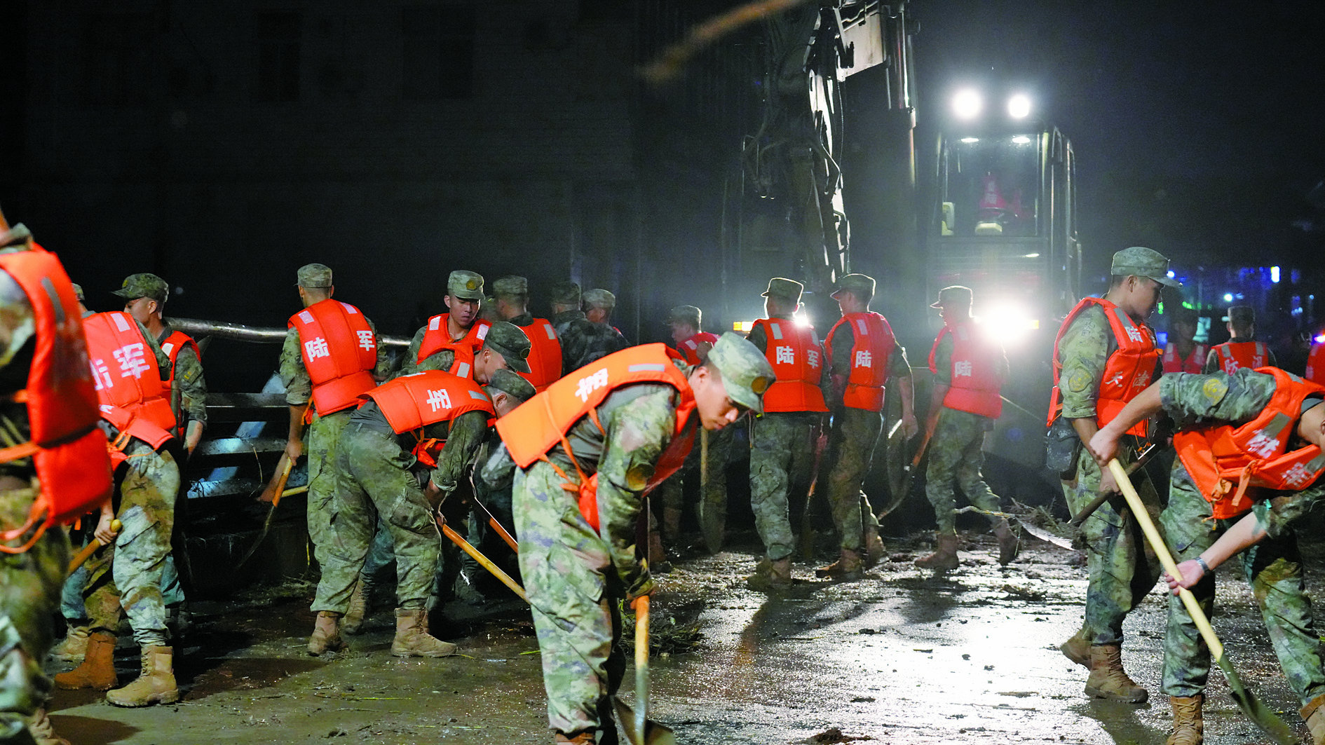 7月28日,陆军第81集团军某旅官兵在天津市蓟州区连夜奋战。 新华社发