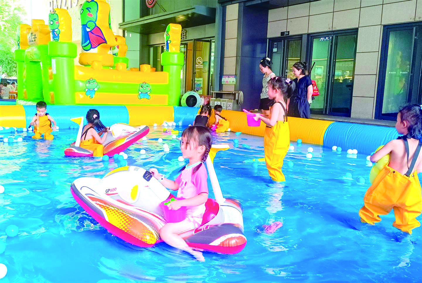 记者 李建林 文/摄 7月28日,市区一商场前设置了两个充气式水池,免费提供玩水工具,孩子们在水池中嬉戏,在欢笑声中感受清凉。该创新消费形态为市场注入活力,吸引市民走出家门去消费。
