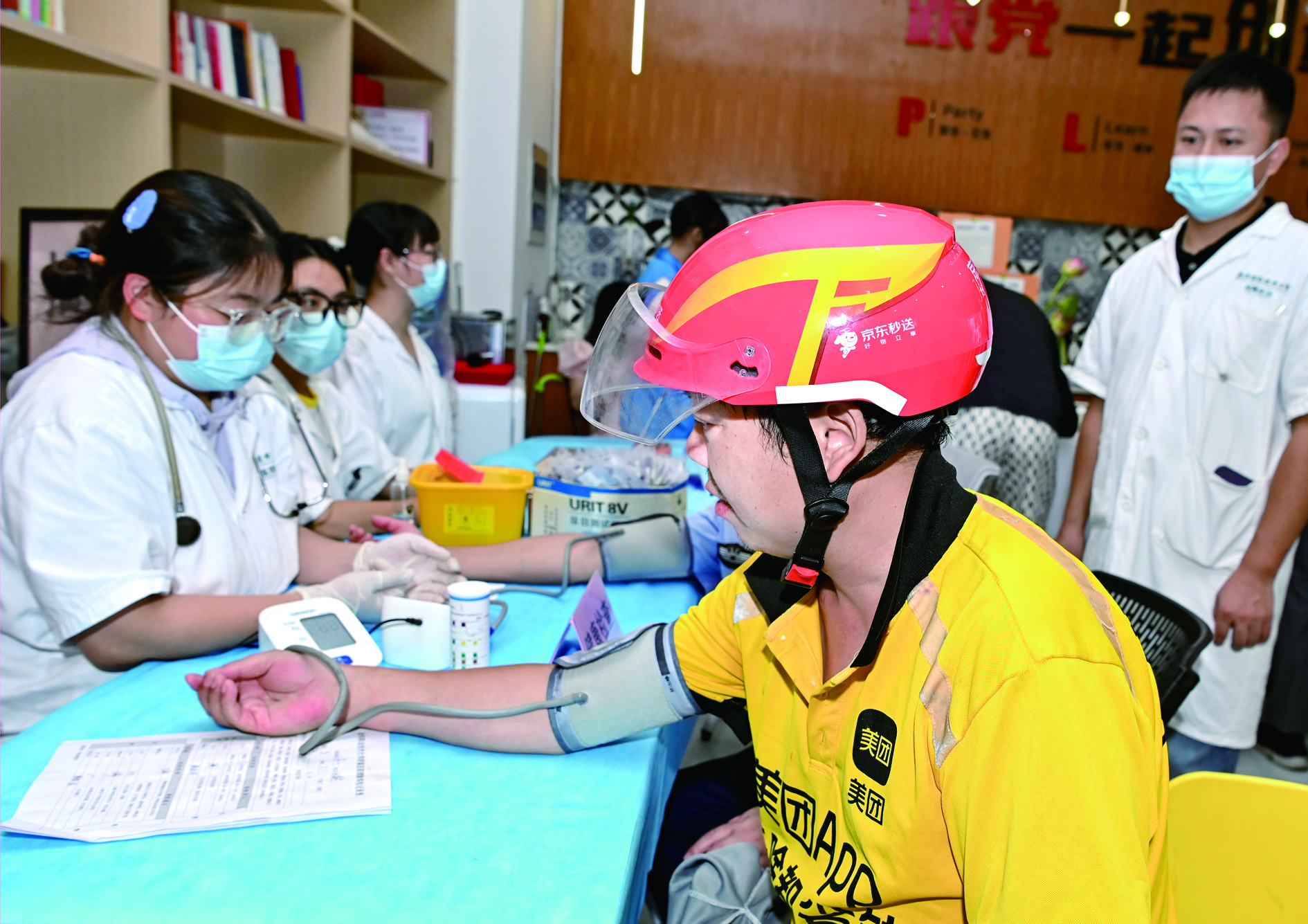 记者 李建林 文/摄 连日来,在金东区多湖街道万江社区工会驿站,医护人员为快递员免费测量血压,提供健康咨询,宣传防暑降温、安全生产、职业病防治等相关知识。
