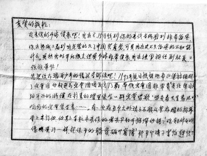 近来你的身体健康吧!我在8月15日收到你的来信,当时感到非常高兴……虽然我的年纪很大,但是身体非常健康,我在社里担任副社长,工作非常忙!