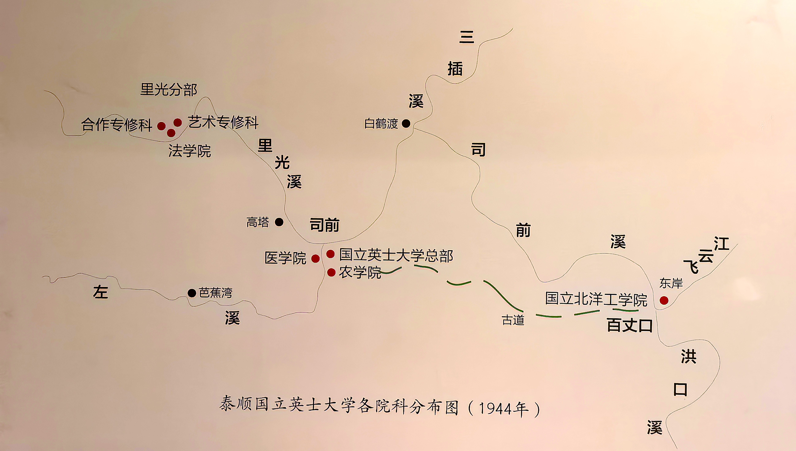 这次迁校行动,开始于1944年8月底,英士大学校长杜佐周率领小顺及云和办事处师生(行政、财政、会计三个专修科跟随所属省政府厅处另地转移),沿着云景古道、景泰古道,于9月中旬到达泰顺司前、里光,与先期抵达泰顺的农学院和医学院会合,并将法学院、艺术专修科、合作专修科和农、医二院一年级设在里光村,农、医二院二年级及以上仍设在司前村。从英士大学独立出去的北洋工学院则在百丈办学。