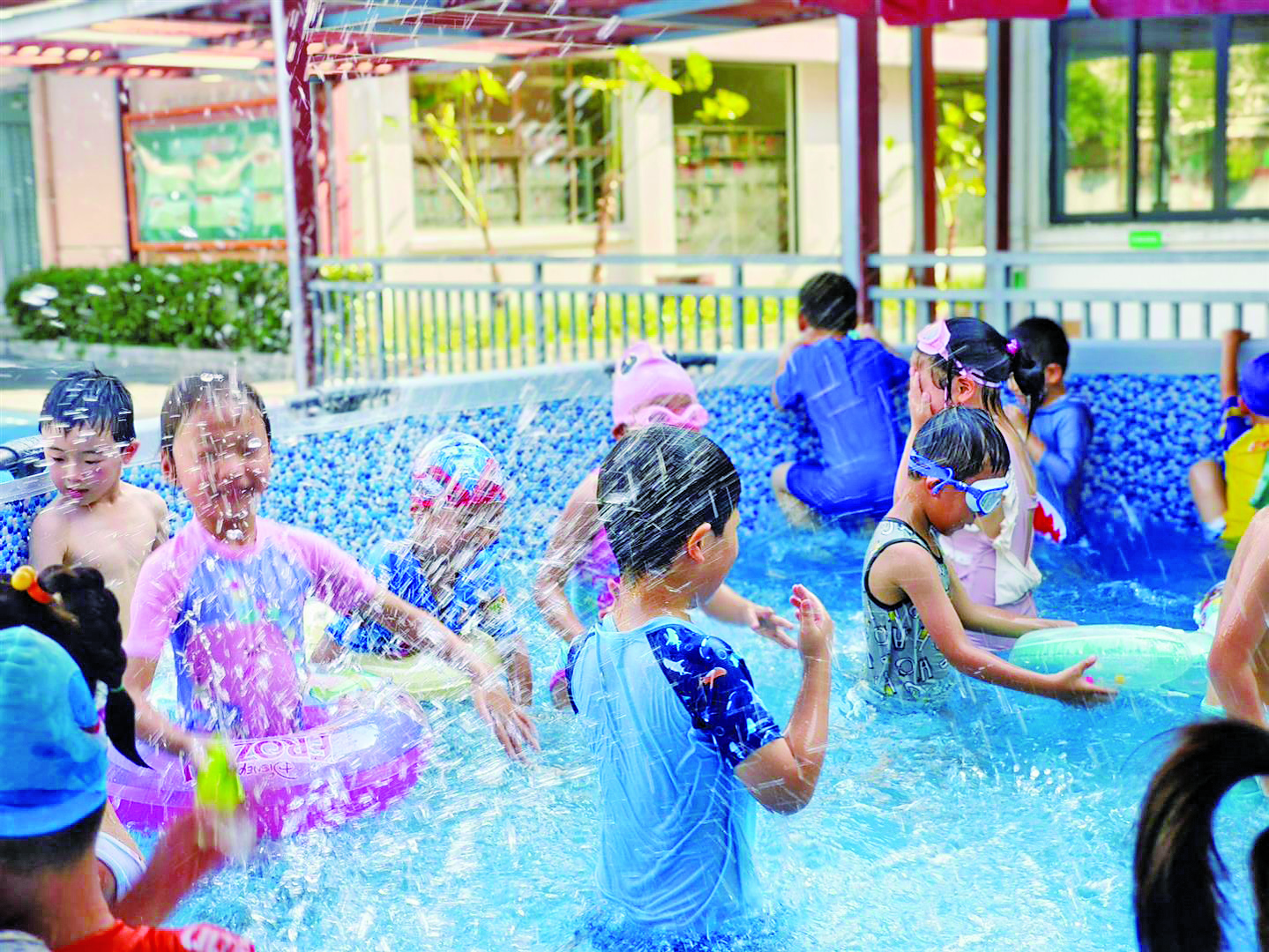 近日,在金华开发区江南街道中心幼儿园,一个户外泳池设备成为孩子们喜爱的游乐设施。根据小、中、大班孩子不同的身高,老师们适时调整水位,让孩子们安全地在水中享受清凉与快乐。