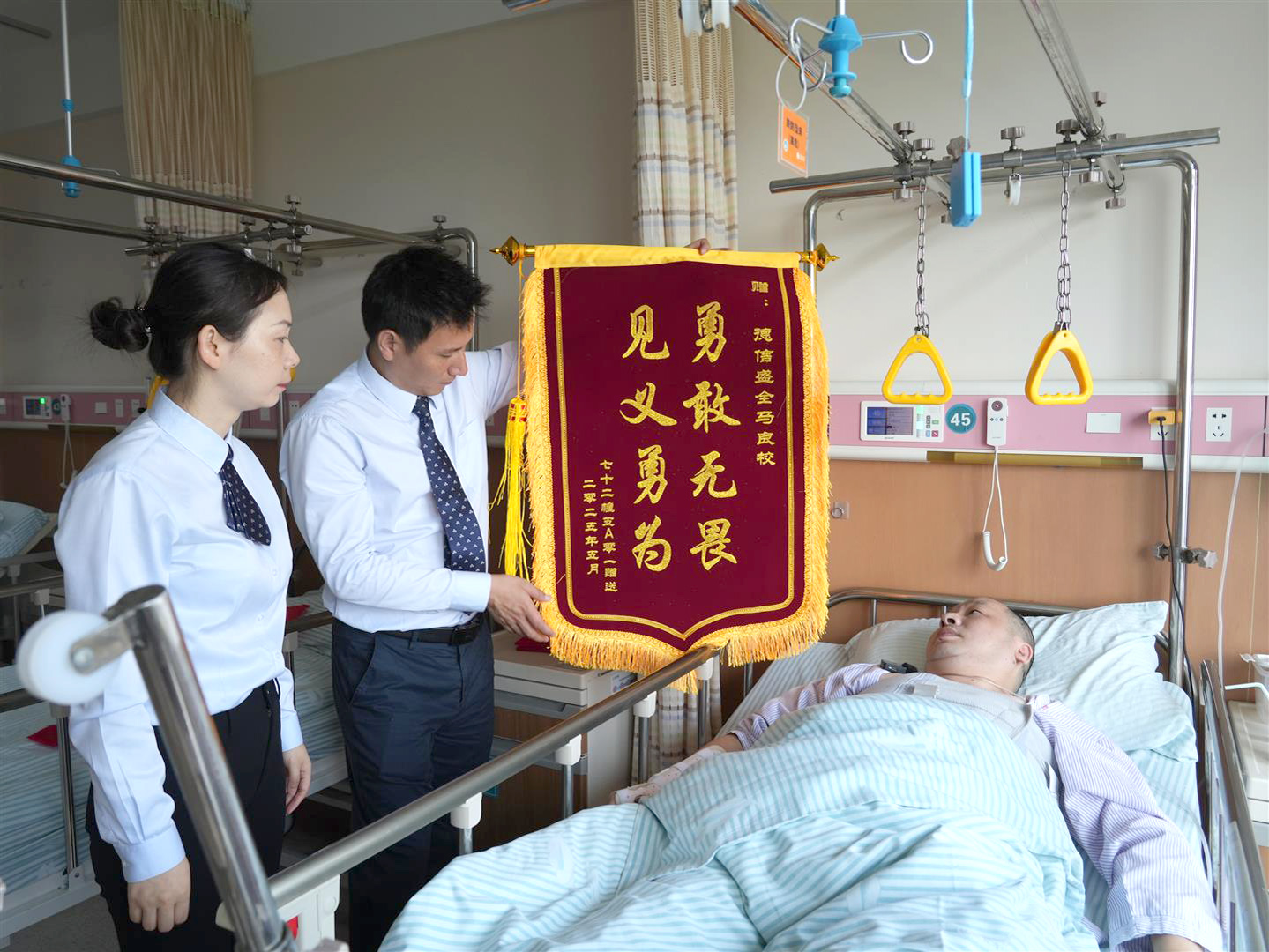 日前,躺在医院病床上的马良校收到金华市公安局江南分局送来的见义勇为行为确认证书,还有业主代表将一面锦旗送到医院,上面写着:见义勇为,勇敢无畏。由于报警及时,警方根据物业提供的照片等关键线索快速破案,业主的财物也没有遭受任何损失。而马良校却仍在医院的病榻上与伤病抗争。初步诊断显示,他左侧胫腓骨下段及距骨骨折、右侧尺骨远端骨折、两肺受损、右侧及左侧共计13根肋骨骨折,伤势较重,令人揪心。病床上,晨光透过病房的纱帘,将“见义勇为”四个字照得锃亮。