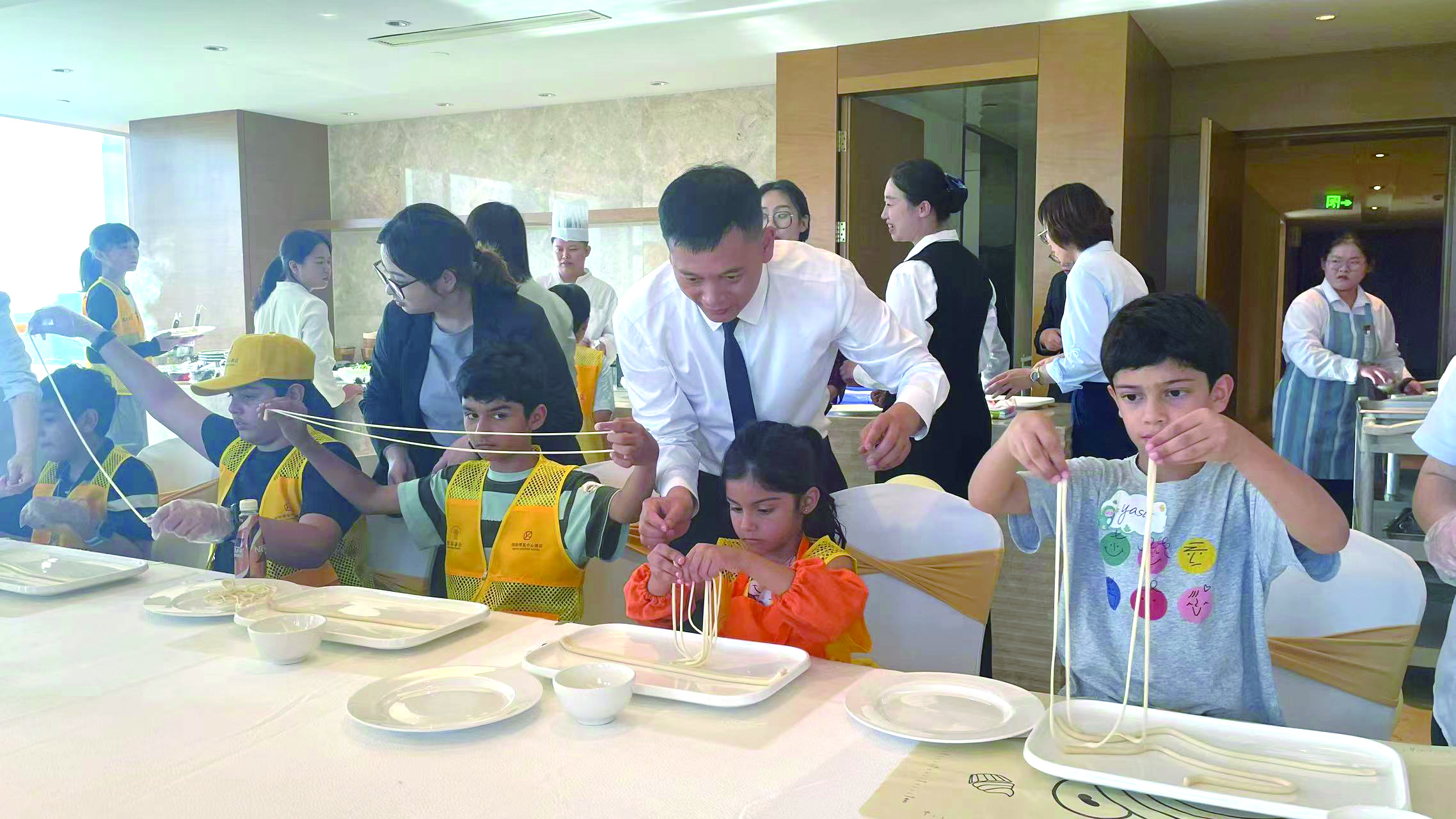 记者 龚喜燕 文/摄 7月29日,在义乌国际博览中心酒店的精心组织下,来自义乌市江东街道鸡鸣山社区的16名“小老外”及6名本土“商二代”走进义乌国际商贸城、美术馆等地,摇着拨浪鼓看“商品海洋”、画“我眼中的商贸城”、制作义乌拉面、品义乌各种传统美食,感受“别样的义乌”。 据悉,参与此次“向日葵的小花伞”活动的“洋二代”主要来自巴基斯坦、叙利亚、也门、印度、厄瓜多尔等国,父母在义乌扎根多年。一到暑期,不少外商也面临“带娃难”。社区贴心为家长减负,举办了多场夏令营。此次携手酒店带娃走出来看义乌,既丰富他们的暑期生活,也加强中外文化交流,进一步增强外商对义乌的认同感。