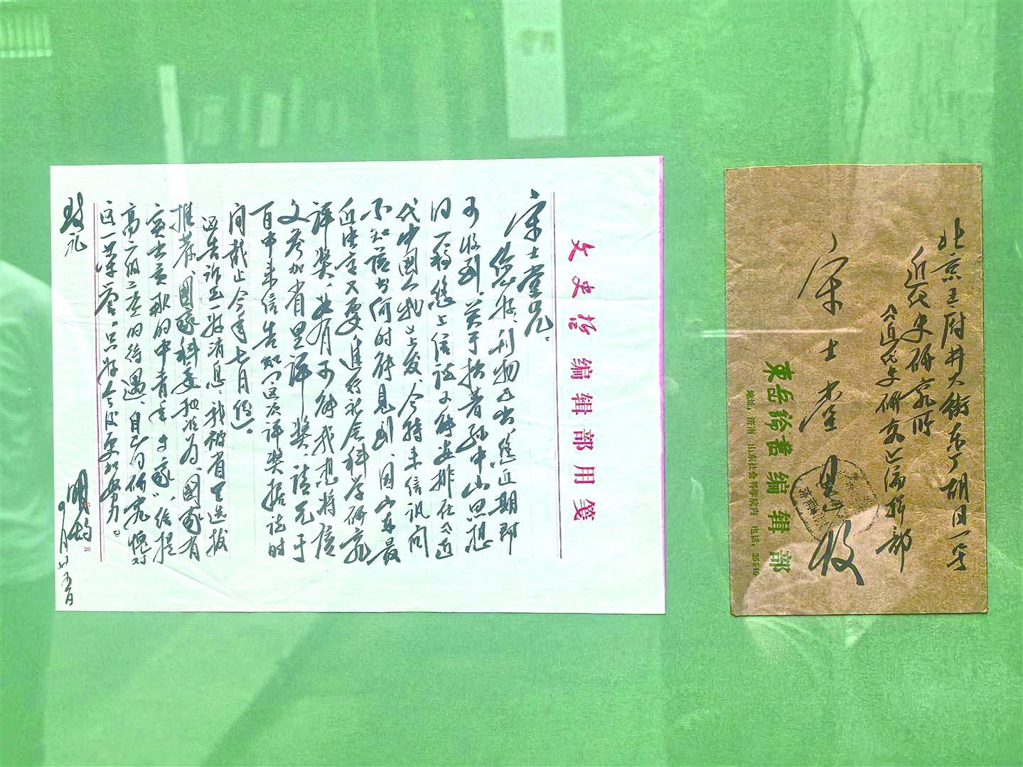 章竟成说,这些信札大多是他通过拍卖、古玩行和藏友间互通等方式得来。纵观展出的信札,不少与报社、杂志社有关。比如,有亚洲食学论坛主席赵荣光致《中国文化研究》编辑部的信札,有写给《文艺报》编辑的信札,还能看到写有“文史哲编辑部用笺”字样的信笺以及写有“红旗杂志社”字样的信封。