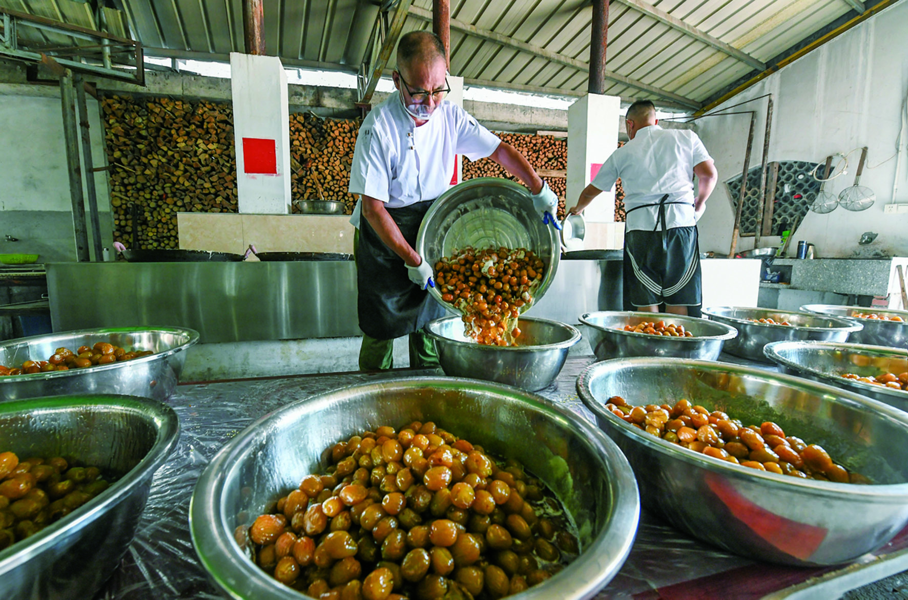 记者 时宽兵 文/摄 昨日,在兰溪市梅江镇石埠村“共富工坊”里,该市金丝琥珀蜜枣制作技艺非遗代表性传承人倪如通,带着村民用传统工艺加工蜜枣。 金丝琥珀蜜枣是兰溪市的土特产,选用优质青枣,经过切枣、熬枣、烘干、摊凉等多个工序制成。8月是蜜枣的生产加工旺季,“共富工坊”通过微信、抖音等网络平台,把蜜枣销往全国各地,带动村民增收致富。