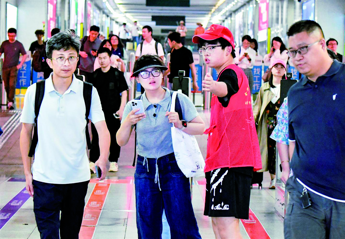 记者 李建林 文/摄 昨日,在铁路金华站出口处,一名中学生为旅客指引道路。暑期里,不少中学生在铁路金华站以参与志愿服务的方式践行文明、接触社会、增长见识。