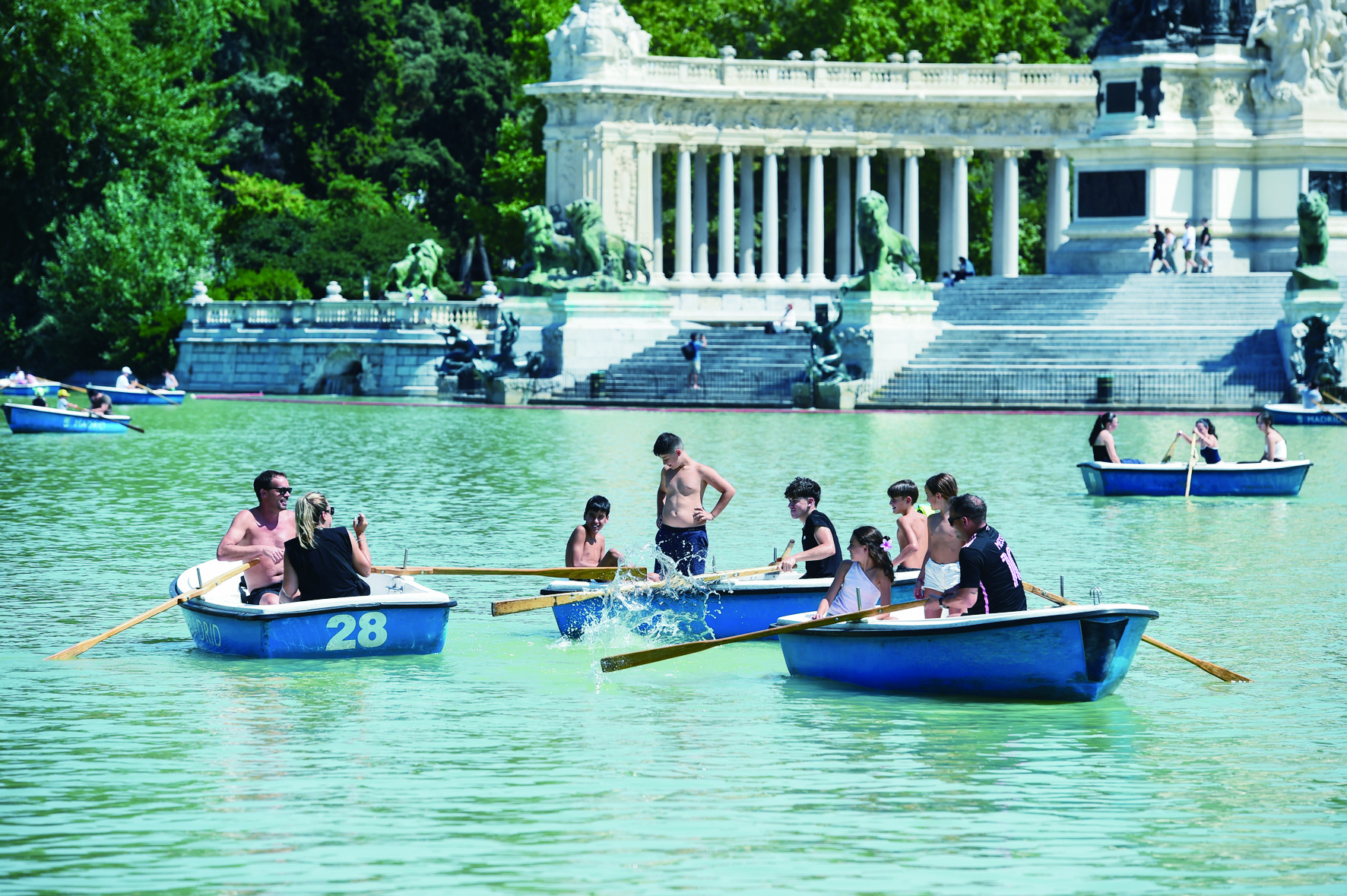 8月4日,人们在西班牙马德里的丽池公园划船。 当日,西班牙国家气象局发布特别提醒,全境大部分地区受到热浪影响,西南部地区最高气温预计突破42摄氏度。 新华社发
