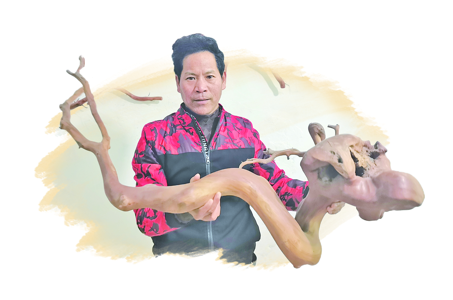 “无论是山间野林,还是河边湖畔,只要发现有价值的树根,我都如获至宝。”王花荣的脚步不仅遍布义乌及周边地区,还延伸至贵州、云南等山区。他不断寻找有价值的树根,将乡村自然之美与文化之韵相结合,打造出具有乡村特色的文化产品。在艺术创作的同时,他还十分注重绿色环保理念,坚持取材有度、保护生态,让每件作品都成为自然与人文和谐共生的见证。