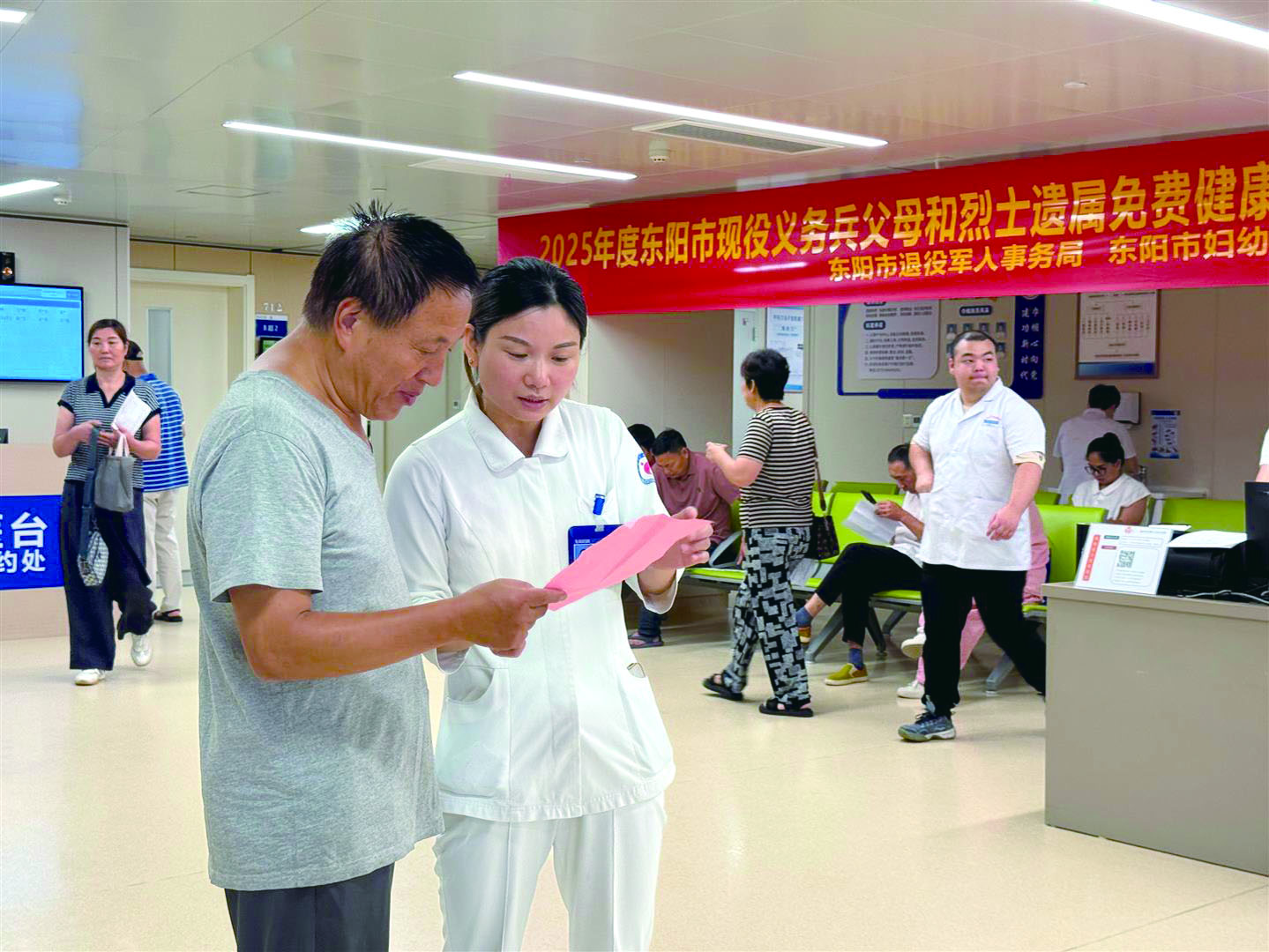 8月1日,现役义务兵父母及烈属专属免费体检在东阳市妇幼保健院启动。血常规、肝肾功能、B超等10余项检查构成“健康套餐”,全程由专人引导,检后还将建立电子健康档案并提供后续管理服务。吴宁街道军属陈淑贞感动地说:“孩子保家卫国,我们被悉心呵护,这份温暖太实在了。”