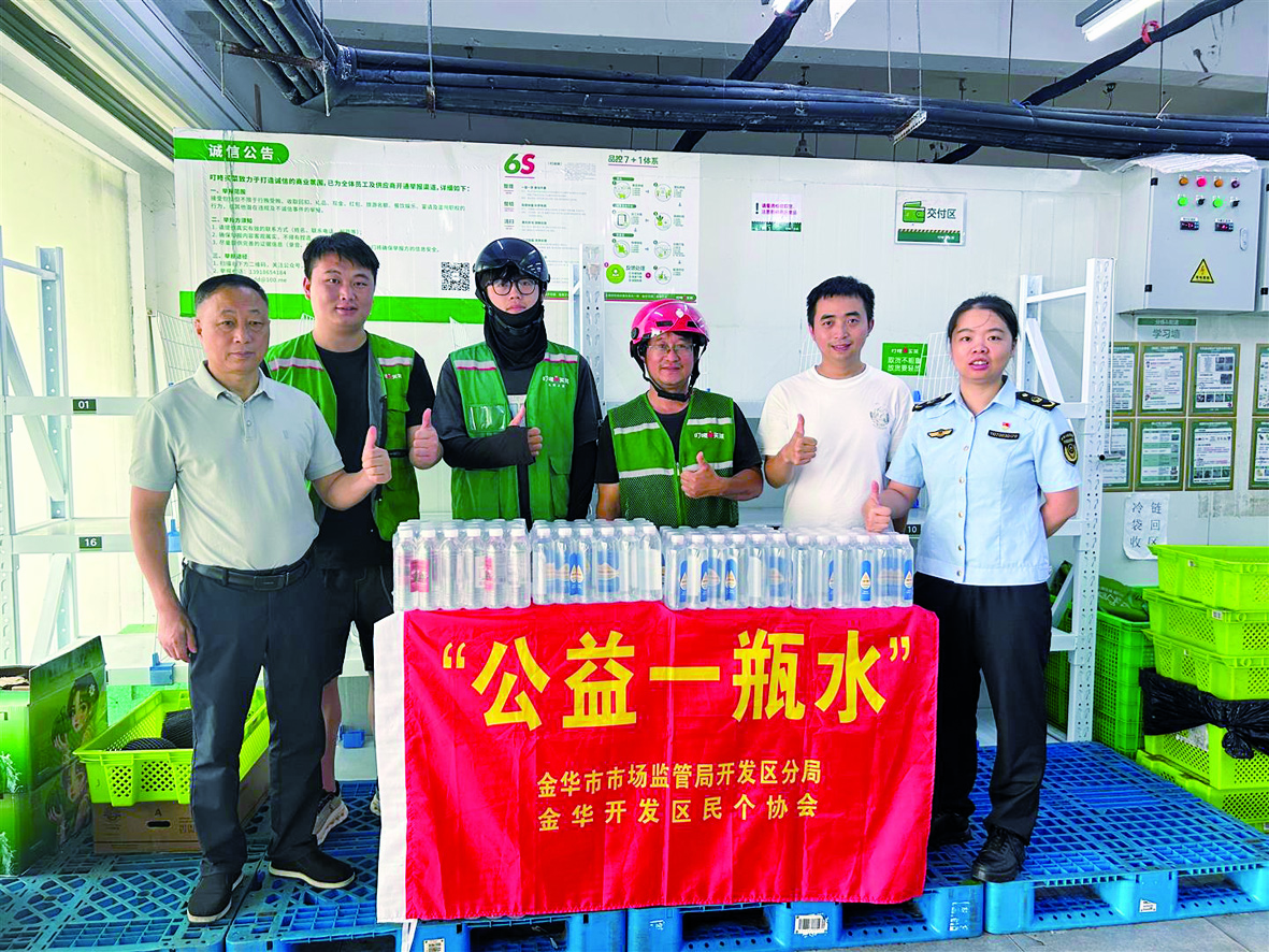 本报消息(记者 胡晨歆 文/摄)8月6日,市市场监管局金华开发区分局联合金华开发区民个协会,来到美团、饿了么等外卖配送站点以及骑手暖心驿站、企业自营取水点开展“公益一瓶水”活动,为夏日奔波在配送一线的外卖骑手们送去清凉与关怀。