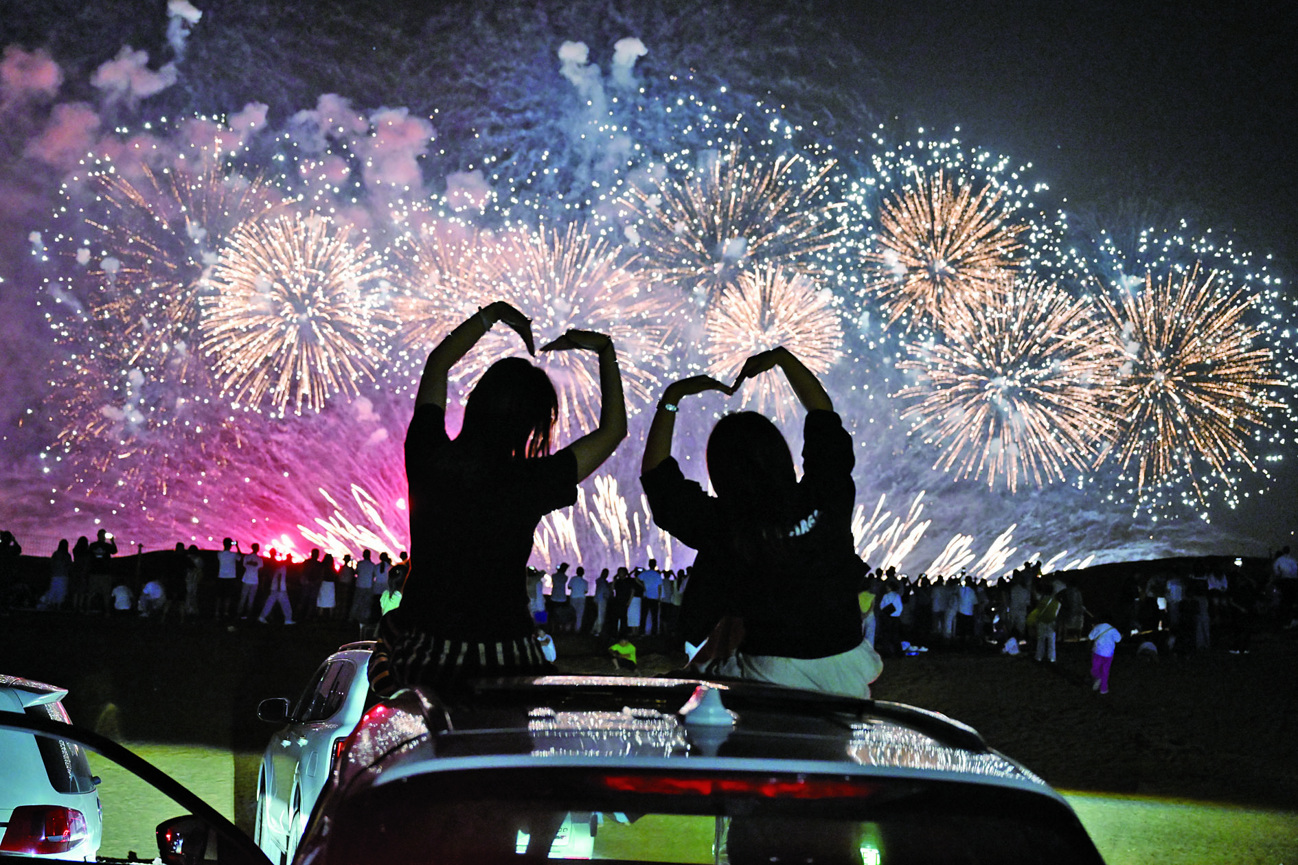 8月10日,游客在宁夏中卫市沙坡头区观看烟花表演。进入暑期以来,各地迎来旅游高峰。 新华社发
