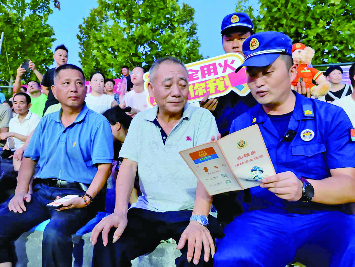 记者 王志坚 通讯员 宗琳玲 文/摄 8月1日至15日,义乌市举办“苏大强”村BA篮球联赛。赛场边,一抹抹亮眼的“消防蓝”吸引了众多目光。 义乌市消防救援支队利用赛事人流量大的特点,在苏溪镇组建消防宣讲小分队,于赛场旁摆摊设点、铺开宣传阵地。 宣传车循环播放的火灾警示片引人警醒,手持“安全用火,幸福你我”“家庭防火注意啥?煤气电源勤检查”等标语板的宣传员穿梭于观赛村民间,另一组则忙着发放消防宣传手册,科普安全知识。
