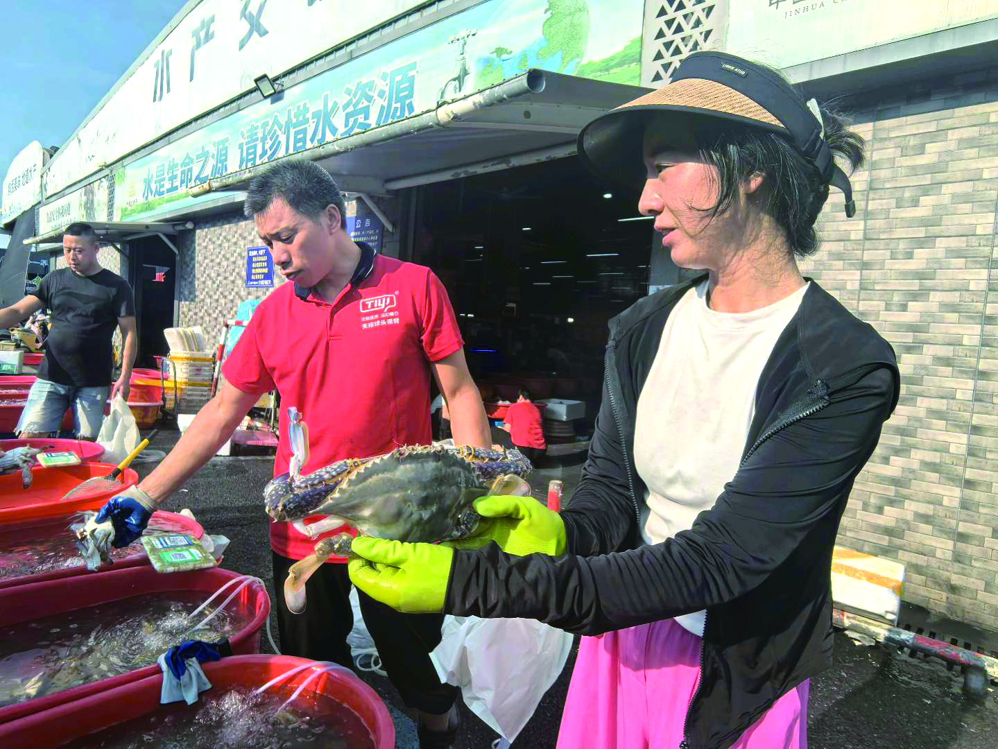 对于消费者来说,价优味美自然更有吸引力。从市区江南赶来买梭子蟹的祝阿姨以120元/公斤的价格,一口气买了4只体形壮硕的大梭子蟹,上秤称将近1.5公斤。“我上周五已经买过一次,也是4只蟹,当时要超200元。”她说,家人是海鲜爱好者,每到这个季节他们都要抢鲜买梭子蟹。“梭子蟹最好的时节就这一个多月,要抓住时机吃最鲜最肥的蟹。”