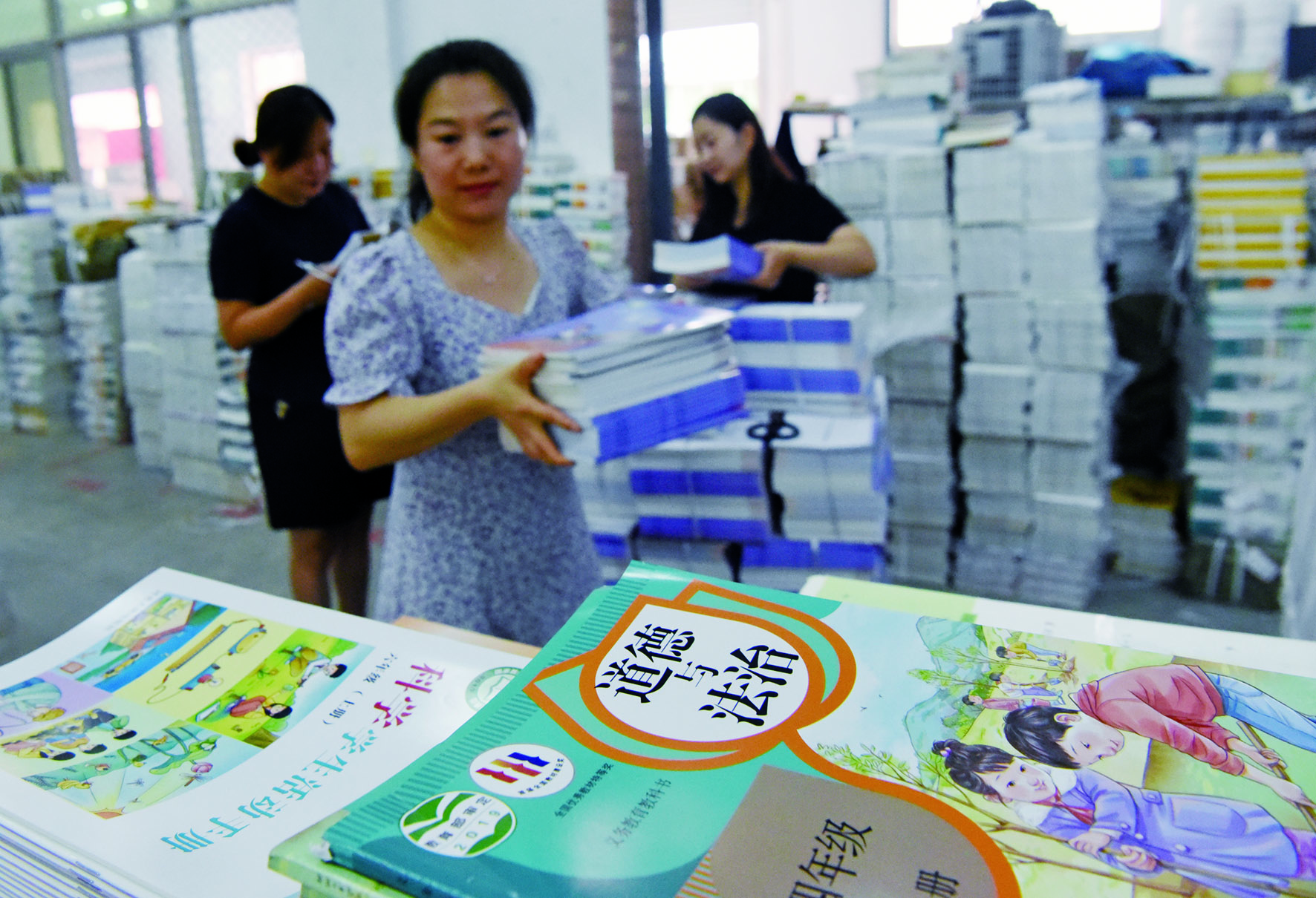 8月14日,河北省石家庄市栾城区新华书店工作人员在仓库搬运新学期教材。 随着中小学开学临近,河北省多地新华书店开始教材和教辅资料的清点、搬运、分发等工作,确保秋季开学前课本教材全部到位。 新华社发