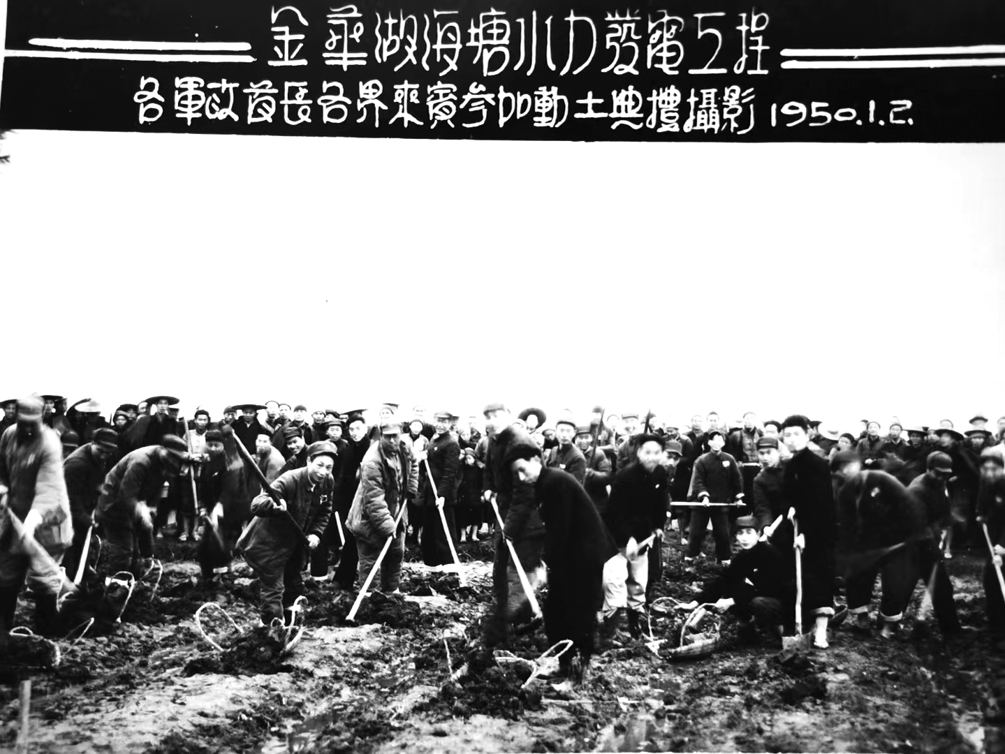 湖海塘水力发电工程破土动工时,照片中,驻防金华的中国人民解放军第35军副政委张雄和副军长胡大荣率领子弟兵,与金华百姓一起挥动锄头,一幅热火朝天的奋战场景。两年前,原南京军区副司令员、原中国人民解放军第35军副军长胡大荣之子胡金华把珍藏了73年的金华湖海塘水力发电工程动工典礼照片、相关信件以及《35军大事记》等档案史料捐赠给金华市档案馆,这些珍贵的历史资料见证了金华历史上那一个轰轰烈烈的水利工程。