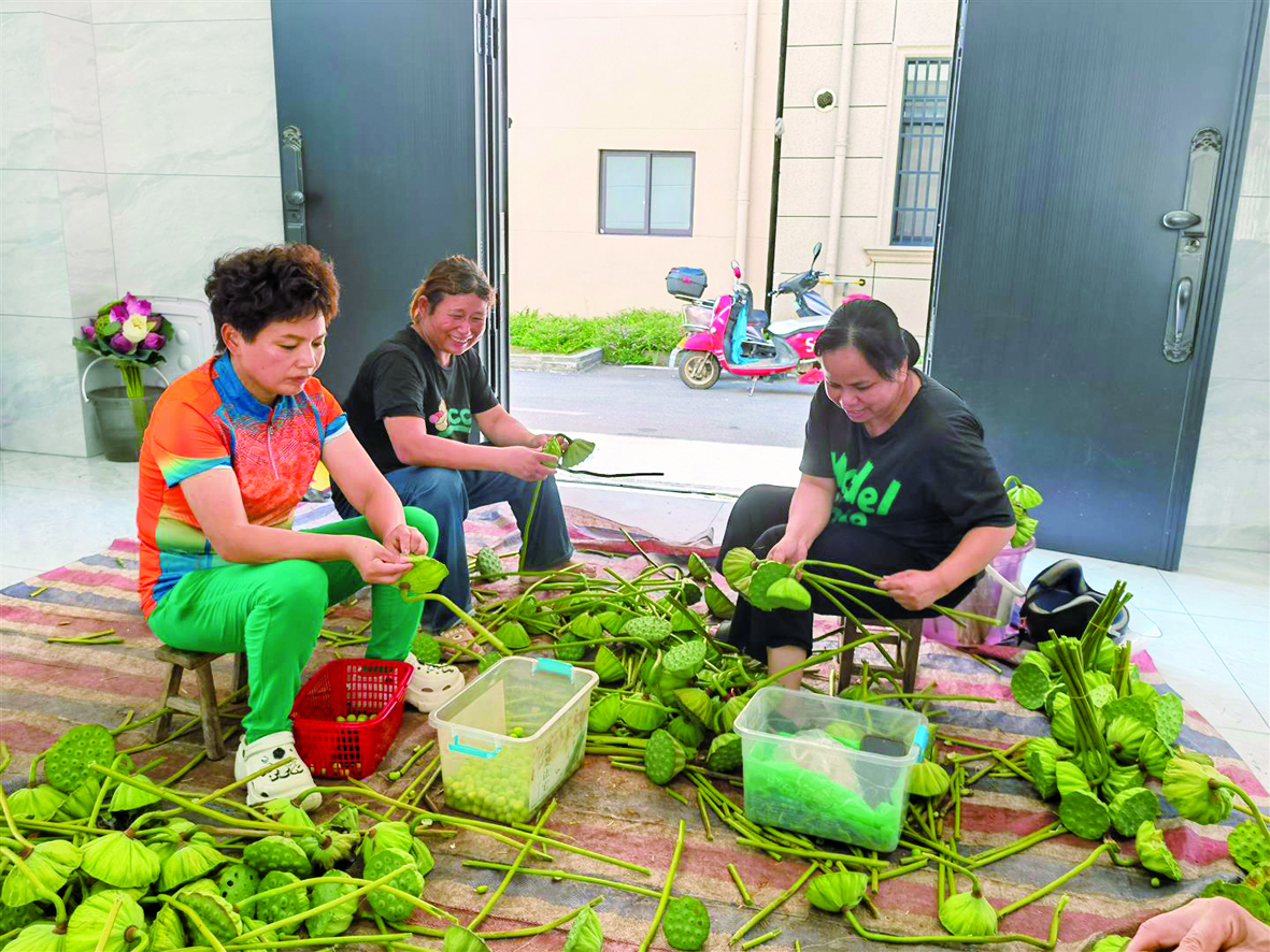 新鲜采摘的水果莲蓬被迅速送至村产业楼,村网格员陆丹华和几名妇女正忙着分拣。虽然不用在烈日下暴晒,但这份工作也不轻松,水果莲蓬要按老嫩程度分类,根据客户需求,剥出莲子后,用碗装好、加冰保鲜,包装成精致礼盒,或挑选大小均匀的莲蓬捆扎成束。长时间重复剥莲子的动作,她们的大拇指和食指都磨出裂口。这些新鲜莲蓬不仅供应本地市场,还被打包发往杭州、宁波、厦门、广州等全国各地。上个月,水果莲蓬销售额达12万元,最高时一天销售额近万元。
