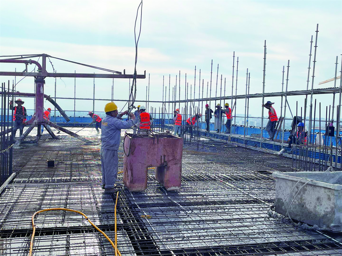 “这几天确实热,但手上的活儿不能停。”来自河南的工人吕卫华一边擦汗一边说:“为了如期完工,我们必须努力奋斗。”一旁,吕卫华的妻子刘莹莹穿着长袖衬衫,头戴遮阳帽,正忙着进行凝泥土找平作业。“一天下来,要喝好几壶水,至少喝掉4升水。楼下有个工棚,里面有空调,吃完饭能去里面休息一会。”刘莹莹说。