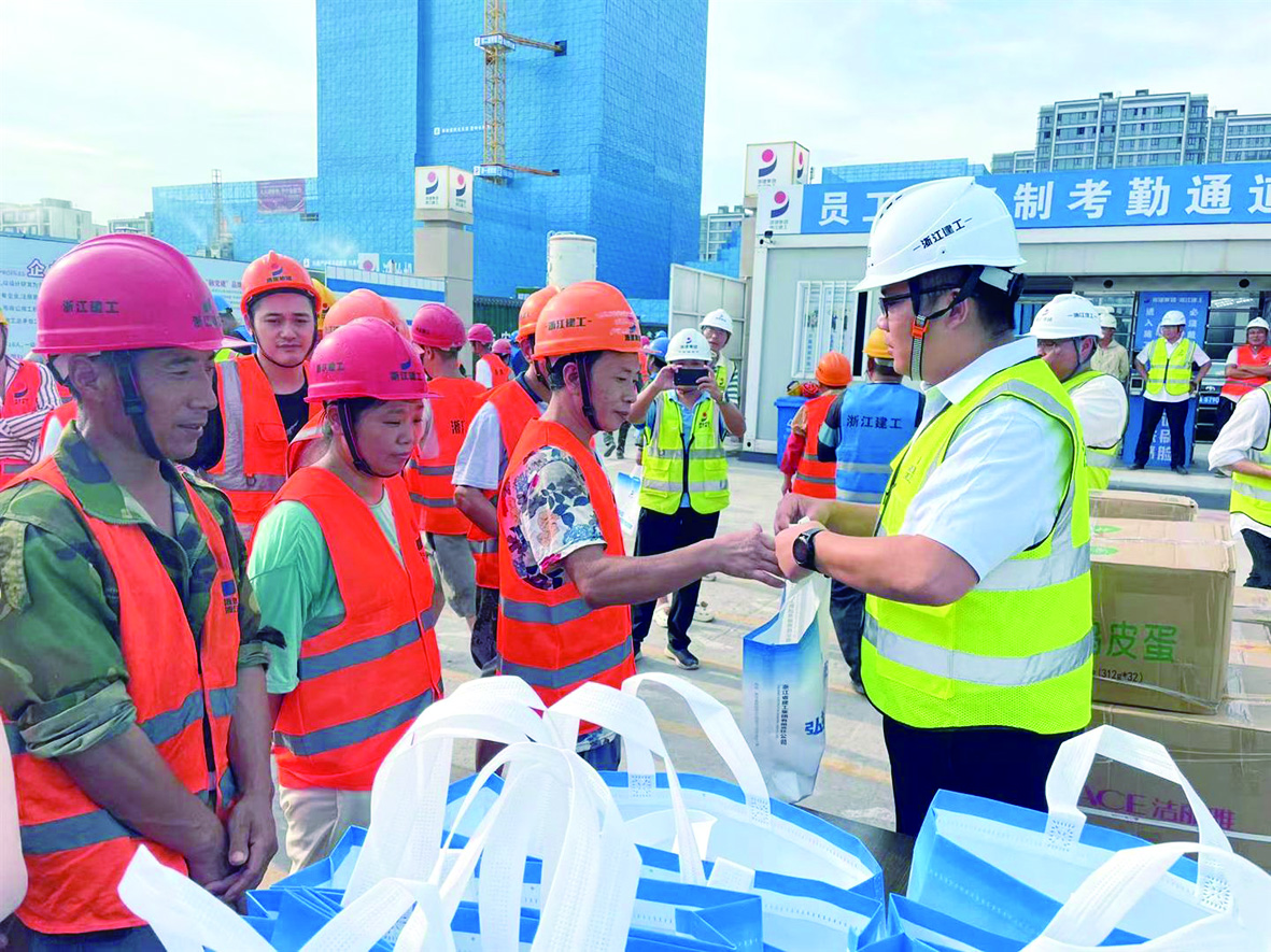 “每天有泥工、塔吊、钢筋、水电等不同班组的超300名工人在工地作业。针对高温天气施工,我们制订高温施工方案,预防工地安全事故发生。”施工方浙江建工金华公司项目生产经理张万华介绍,高温天气给施工带来不小挑战,但工人们都很给力。“目前,工程正按照计划稳步推进,预计能如期完成节点目标。”当天,该公司还为工人们送上冰袖、毛巾、洗发水等“清凉大礼包”。