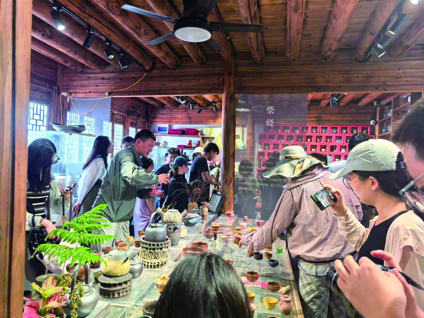 当天,采访团一行先后走进婺州窑体验馆、畲族婚嫁风俗馆、朱志强民俗画馆、田庐咖啡屋等业态空间,感受坛头村多元化的发展业态与满满的活力。“我是第一次来坛头村,感觉这里的古建筑保护得不错,婺州窑也很有特色。”求是杂志社的李璇一边参观婺州窑展示馆,一边了解当地的古村研学情况。