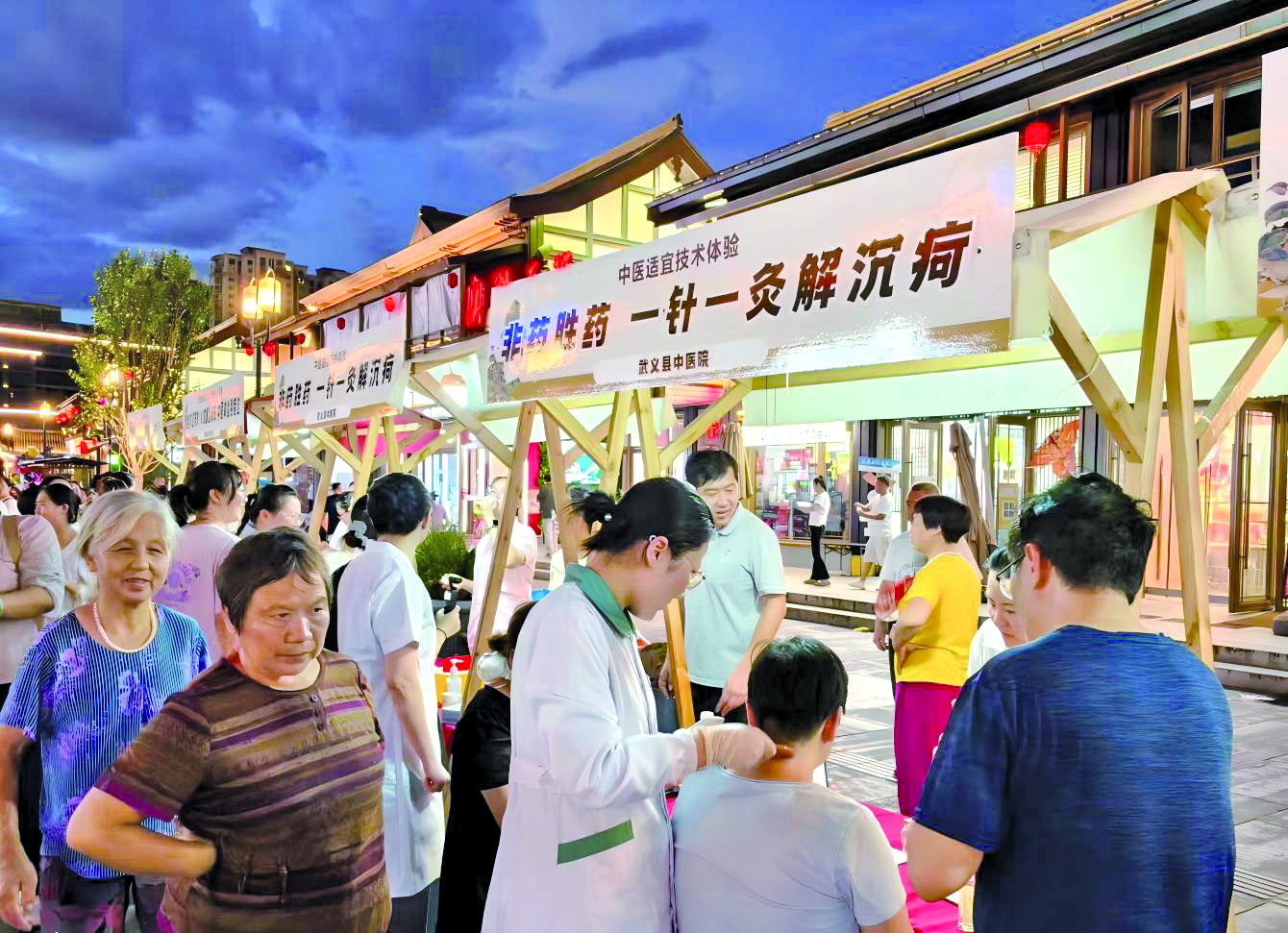 耳穴压豆、手法推拿、拔罐刮痧……在中医适宜技术体验区,有不少市民排队打卡中医特色疗法,其中不乏年轻面孔,大家趁着逛夜市的机会沉浸式体验中医药文化的魅力。