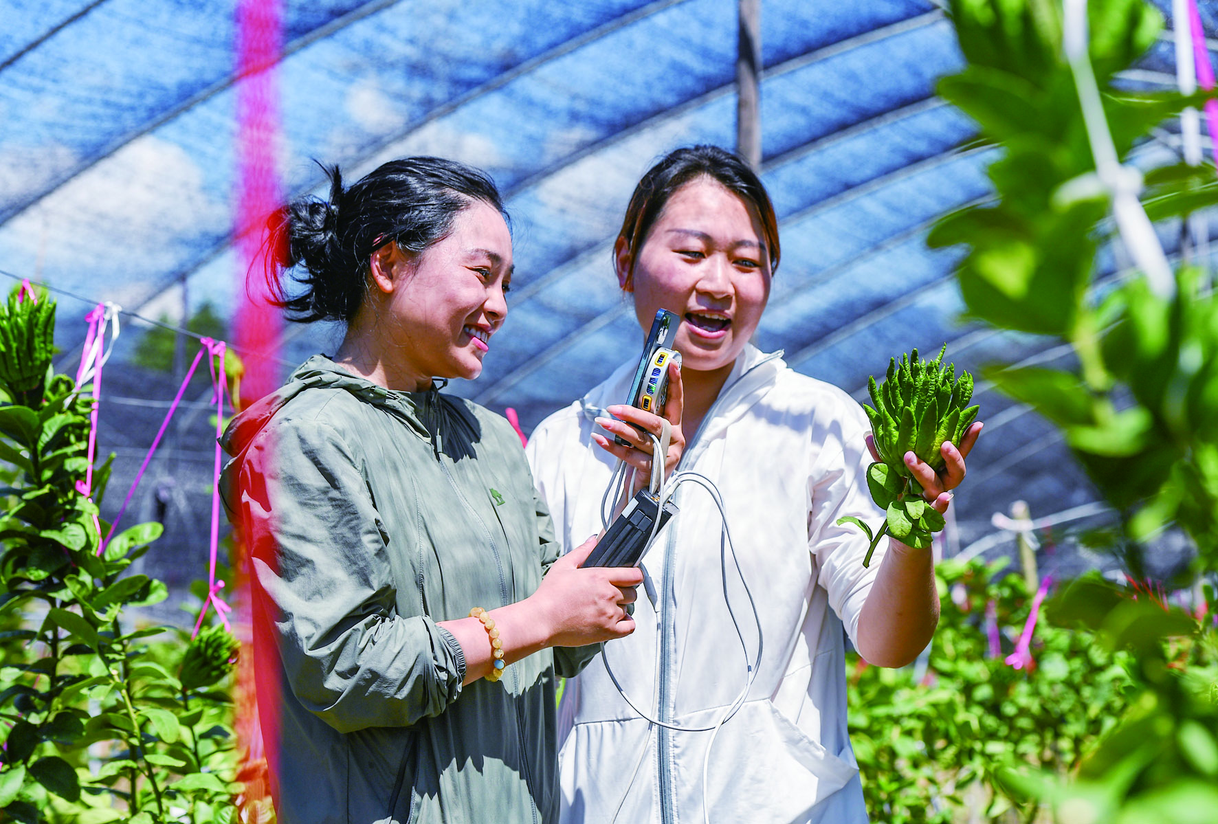 记者 时宽兵 文/摄 昨日,在金东区赤松镇北山口村的佛手种植基地里,村民在直播销售佛手青果。 佛手青果主要用于观赏、插花、闻香等,当地村民通过村庄e万家“共富工坊”直播间和田间直播,把佛手青果销售到全国各地,实现增收致富。