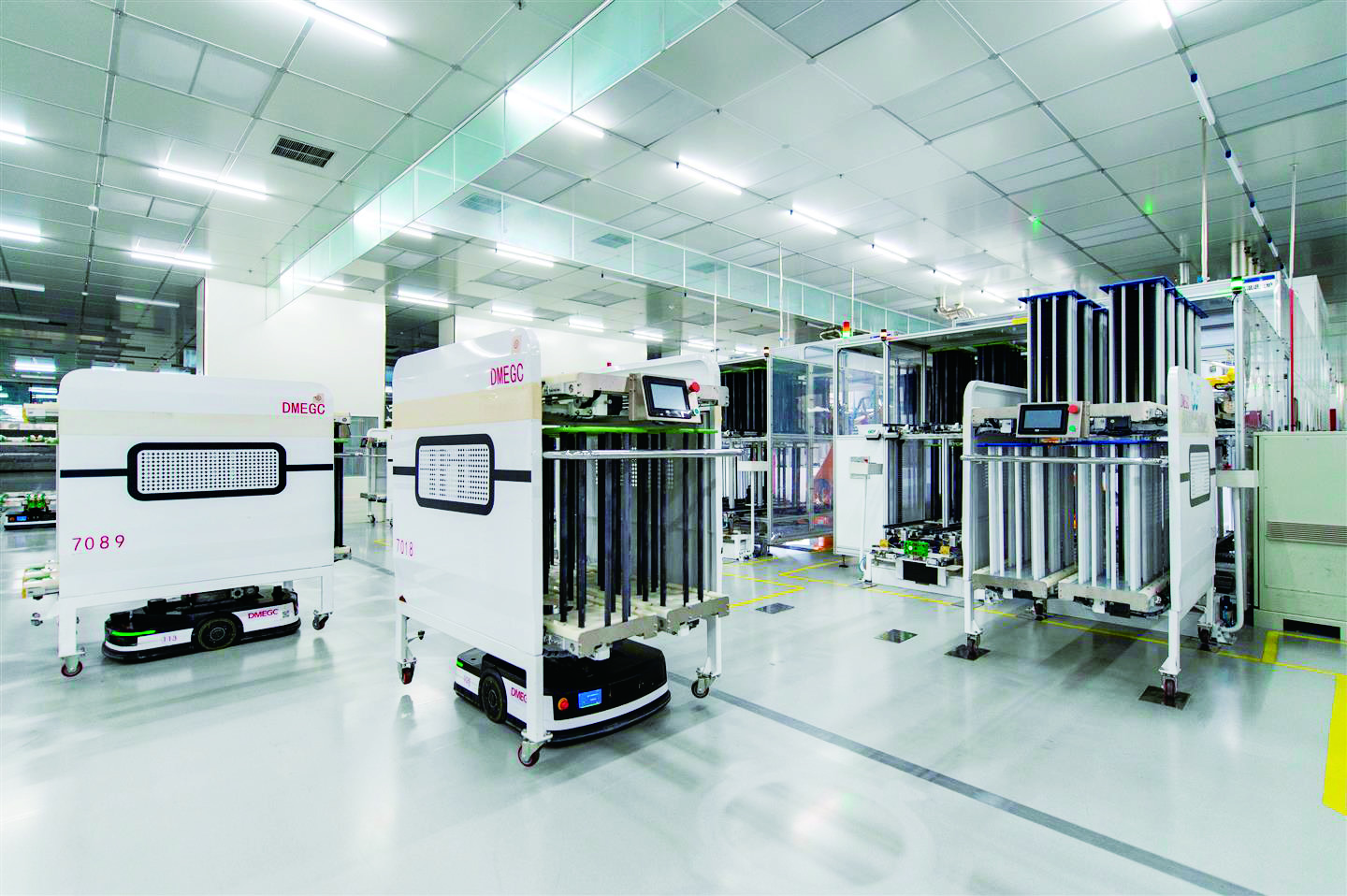 昨日,在东阳市横店东磁太阳能电池片工厂生产车间,AGV(自动导引运输)小车穿梭在各个生产单元之间,承担物流搬运任务。