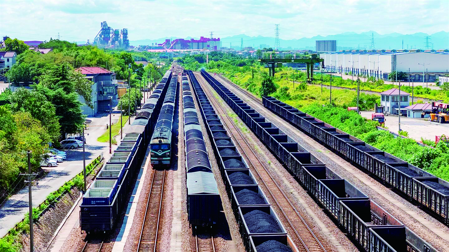 日前,在铁路功塘站货运场,满载煤炭等物资的列车在轨道上运行。这些物资将被输送到浙能兰溪发电公司。