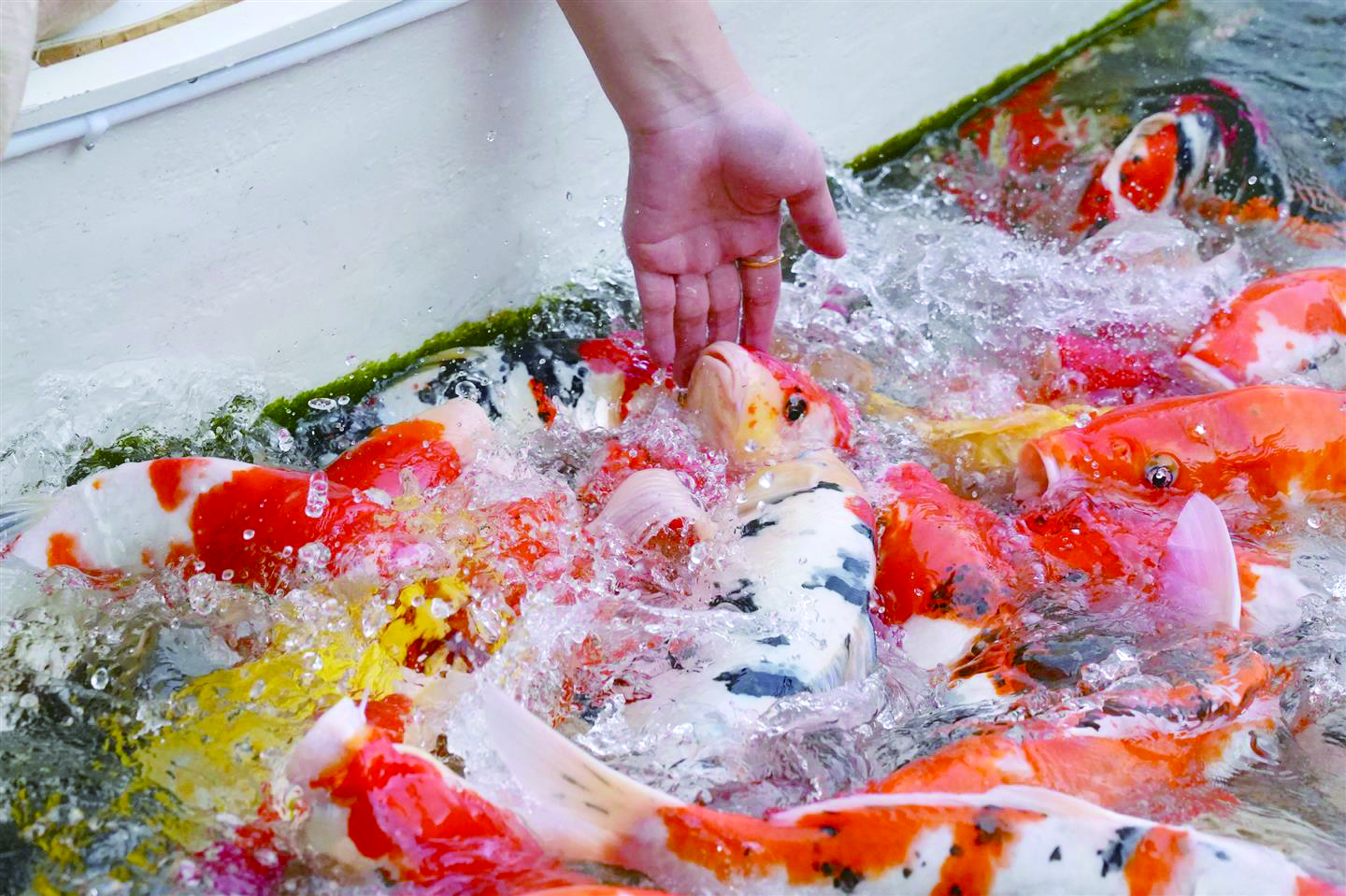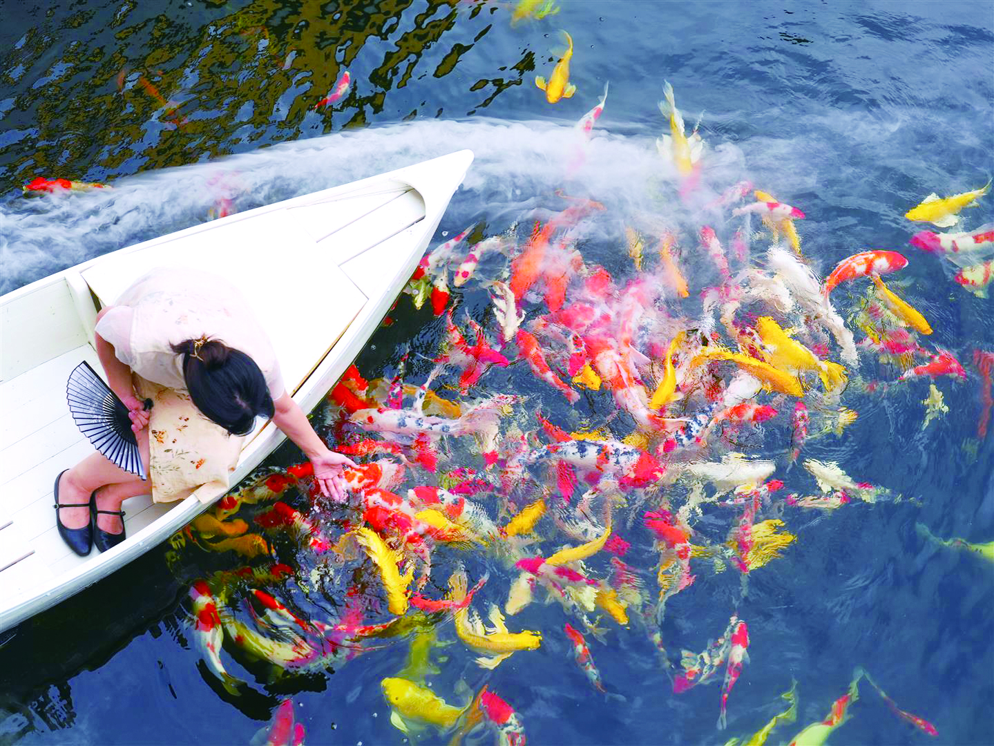 成群结队的锦鲤抢食,色彩艳丽的鱼尾不时在手边滑过,引得游客惊呼:“我摸到鱼了!”8月20日,在金华开发区罗埠老街的梧桐里咖啡馆后院,一方鱼池与一面花墙格外醒目。