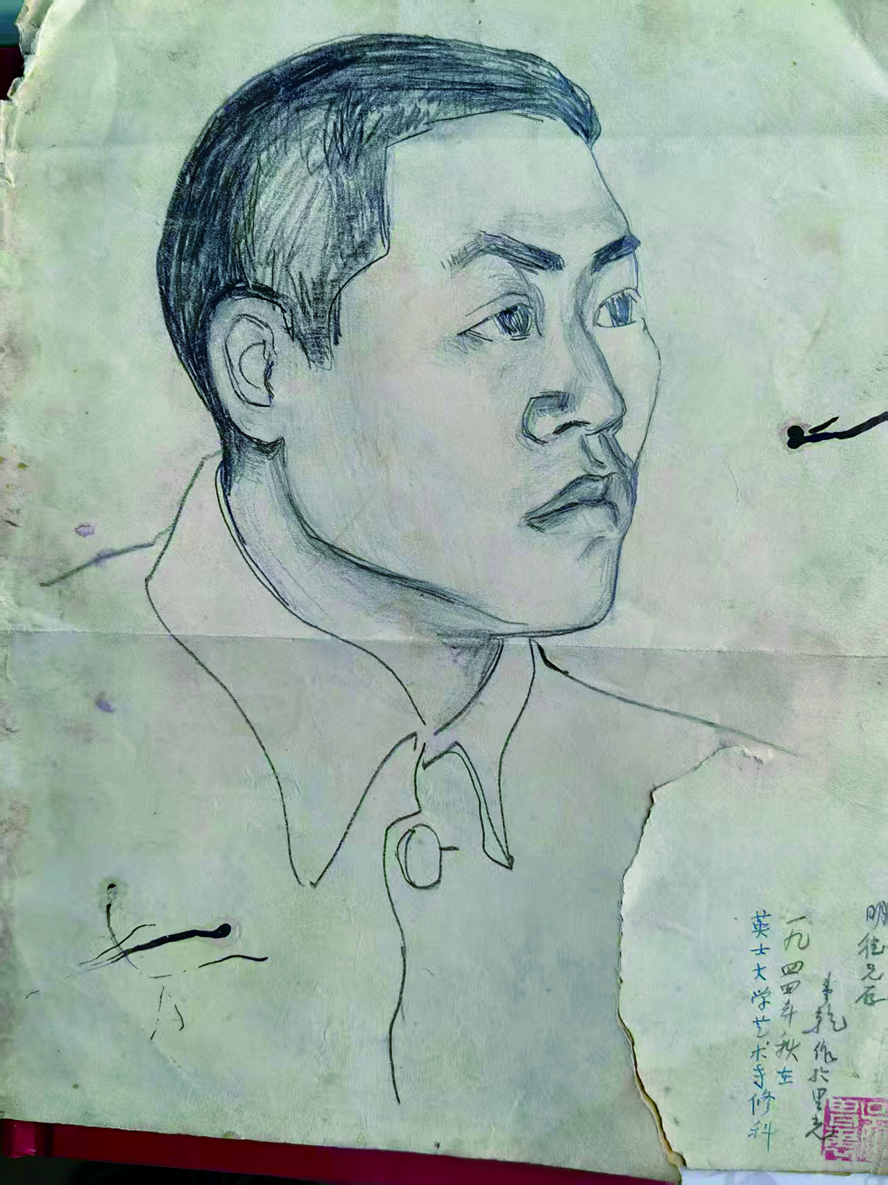 这是一张施明德的肖像画,右下角有几行小字:明德兄存,望乾作于里光,1944年秋在英士大学艺术专修科。望乾即吴汉,东阳人,也曾在英士大学艺术专修科就读。