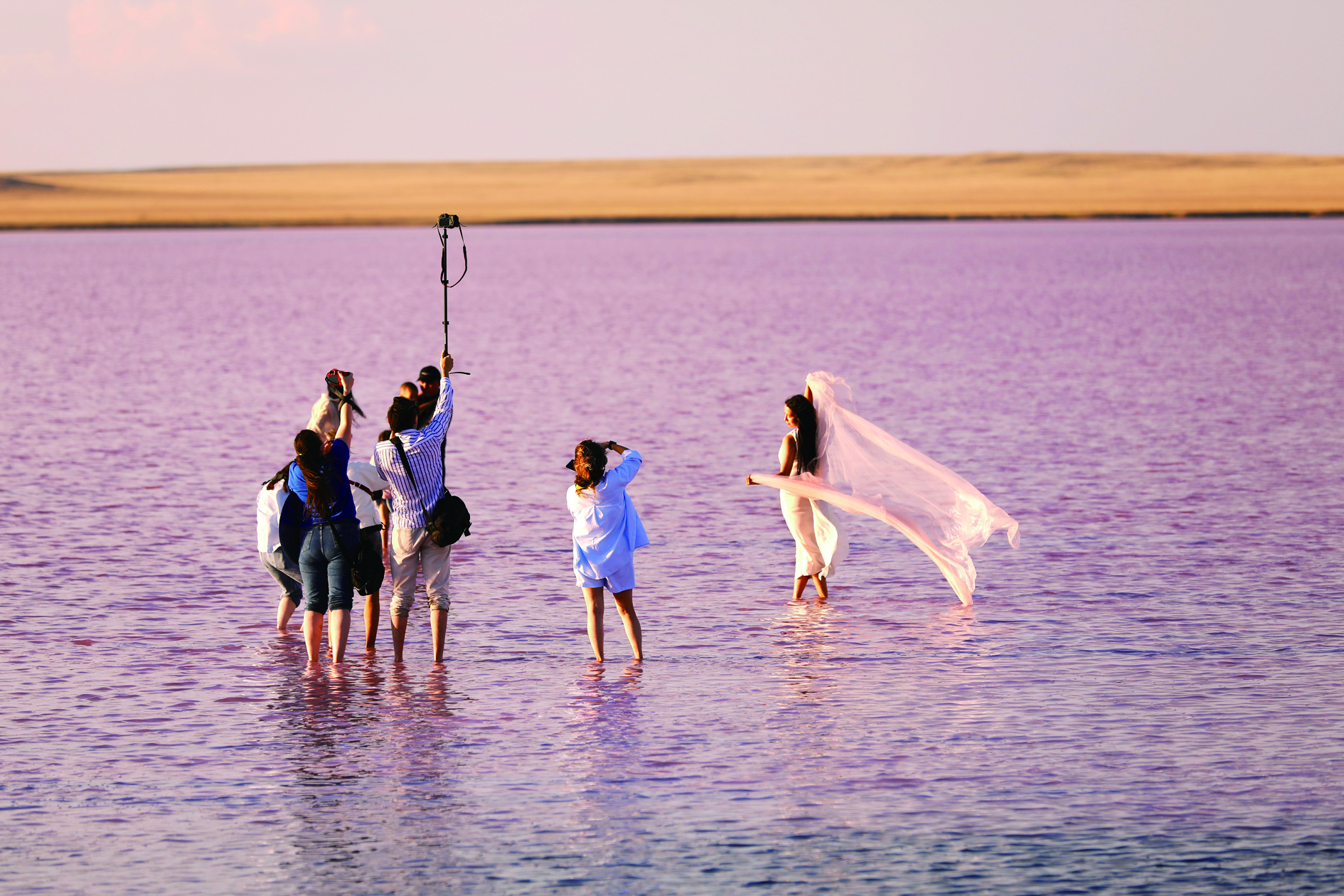 8月23日,在哈萨克斯坦阿克莫拉州,游客在科贝图兹湖中拍摄艺术照。 位于哈萨克斯坦阿克莫拉州的科贝图兹湖,因湖水中的一种微藻在高温干燥的夏季会产生β-胡萝卜素而使湖水呈现出从淡粉色到深玫红色的色彩变化,而得名“粉湖”,是该国著名的网红打卡景点。因旅游承载能力有限和环境问题,科贝图兹湖从2020年起实行封闭管理,并进行生态修复。今年夏季湖区重新对公众开放。 新华社发