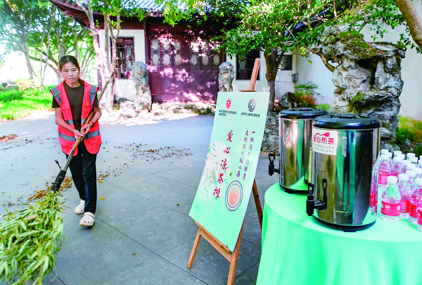 记者 李建林 文/摄 8月23日,位于市区婺州公园新时代文明实践点的爱心凉茶摊,为环卫工人等户外工作者和游客提供免费凉茶。爱心凉茶摊管理方小星球公益协会志愿者说,暑期内每天有100多人次饮用凉茶。凉茶摊虽然不大,但向人们传递着清凉与温情。