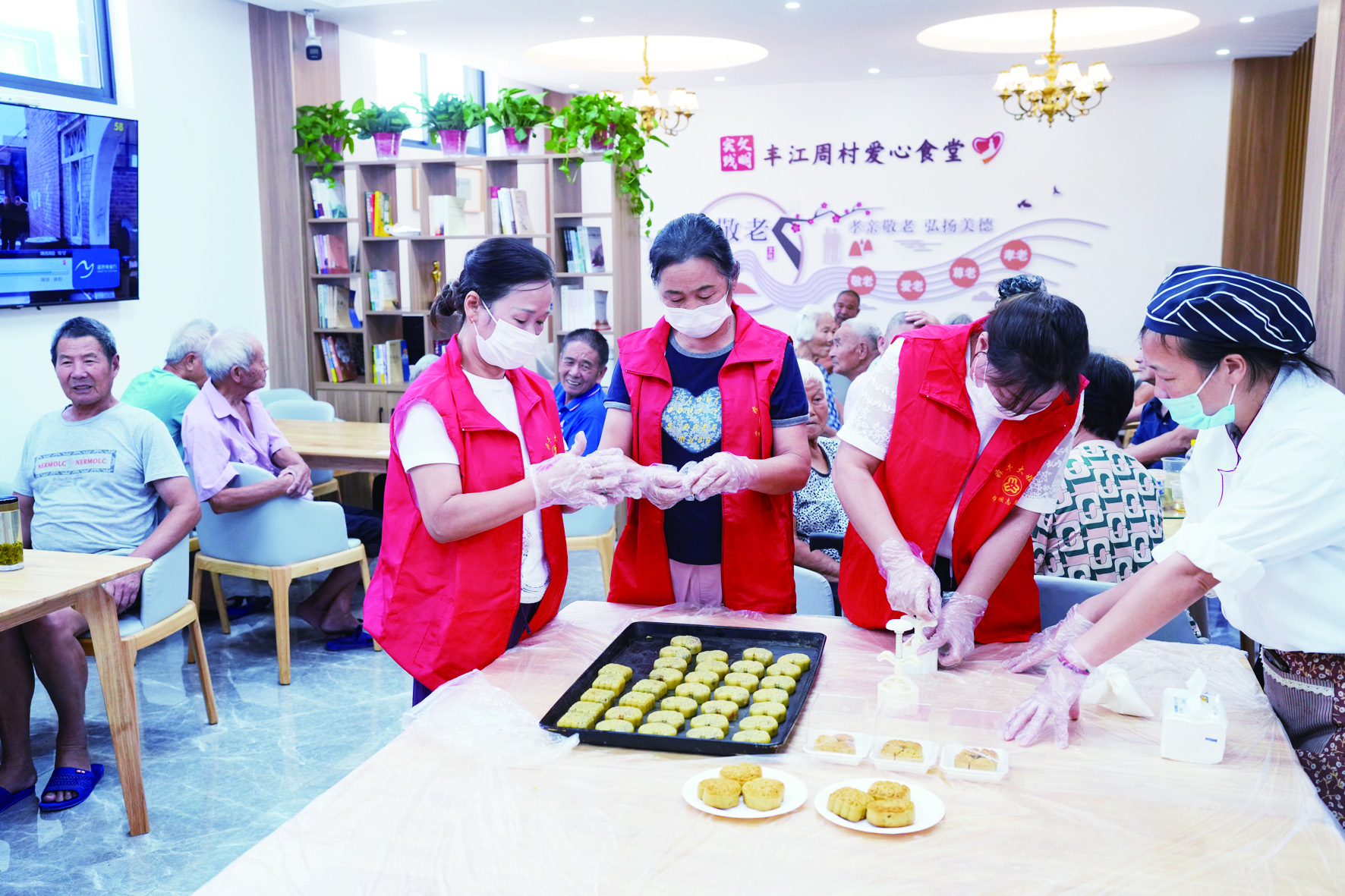 8月26日,在安华镇丰江周村爱心食堂,志愿者做药膳月饼给老人品尝。 近年来,浙江省诸暨市安华镇着力打造“医养融合”服务网,公共卫生服务覆盖老年生活全场景。安华镇以两个片区化中心村卫生室为中心,推动智慧化远程医疗服务落地应用;同时推出家庭签约服务,组建医疗服务志愿队,上门关爱居家老人,提升老年人生活质量与健康保障。 新华社发