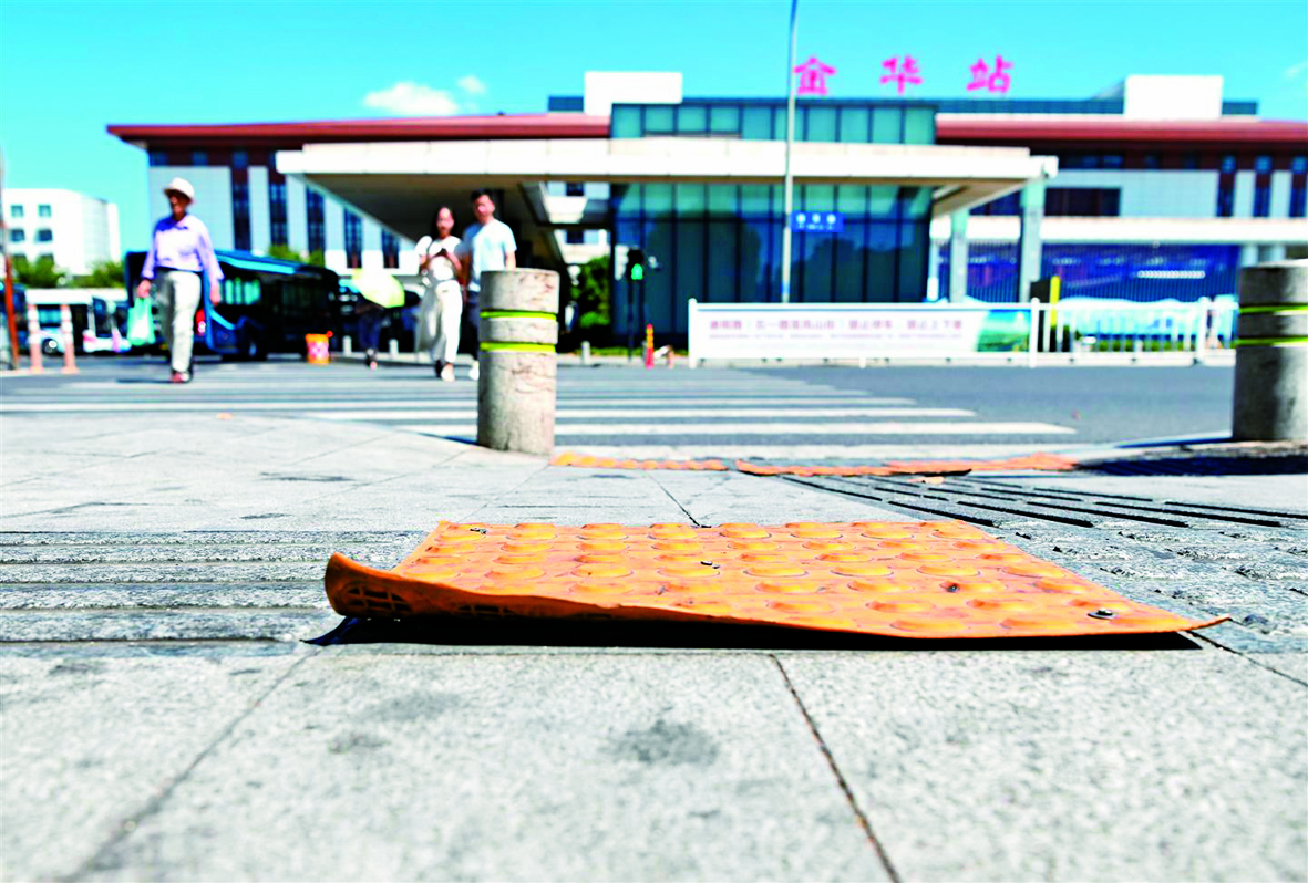 记者 李建林 文/摄 8月25日,在市区迪耳路上,个别路段没有铺设盲道专用地砖,而是用盲道铁皮替代。时间一久,部分盲道铁皮出现边角起翘现象。 由于该路段地处铁路金华站附近,人流量较大,起翘的铁皮对来往行人形成安全隐患。