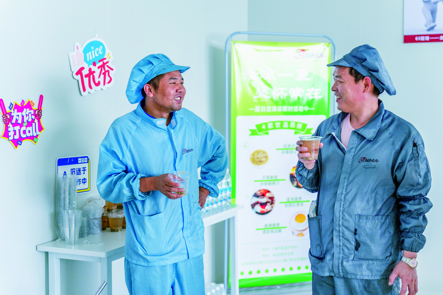 近段时间,浙江润马光能集团后勤人员化身“清凉跑腿员”,为车间员工送去冰镇绿豆汤、酸梅汁、盐汽水等饮品。“高温天,我们每天下午2点安排专人去车间送饮品,另外也在车间配备了防暑药品自助点,员工可以随取随用。”集团人事经理刘锐说,作为一家新能源企业,润马还配备了部分恒温车间,确保寒暑天都不耽误生产。
