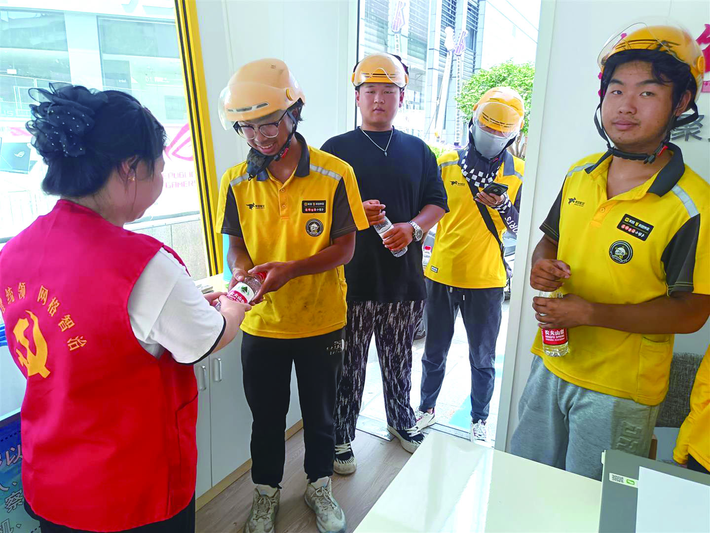 “我来拿瓶冰水,顺便给手机充个电,太热了!”8月13日上午9时50分,刚忙完送餐早高峰的外卖骑手范俊波停好电动摩托车,径直走进位于世贸城市广场东北角的“新”心驿站休息,为即将开始的外卖午高峰做准备。雅苑社区商业氛围浓厚,外卖、快递等新就业群体活跃,每日有近百名骑手穿梭忙碌。