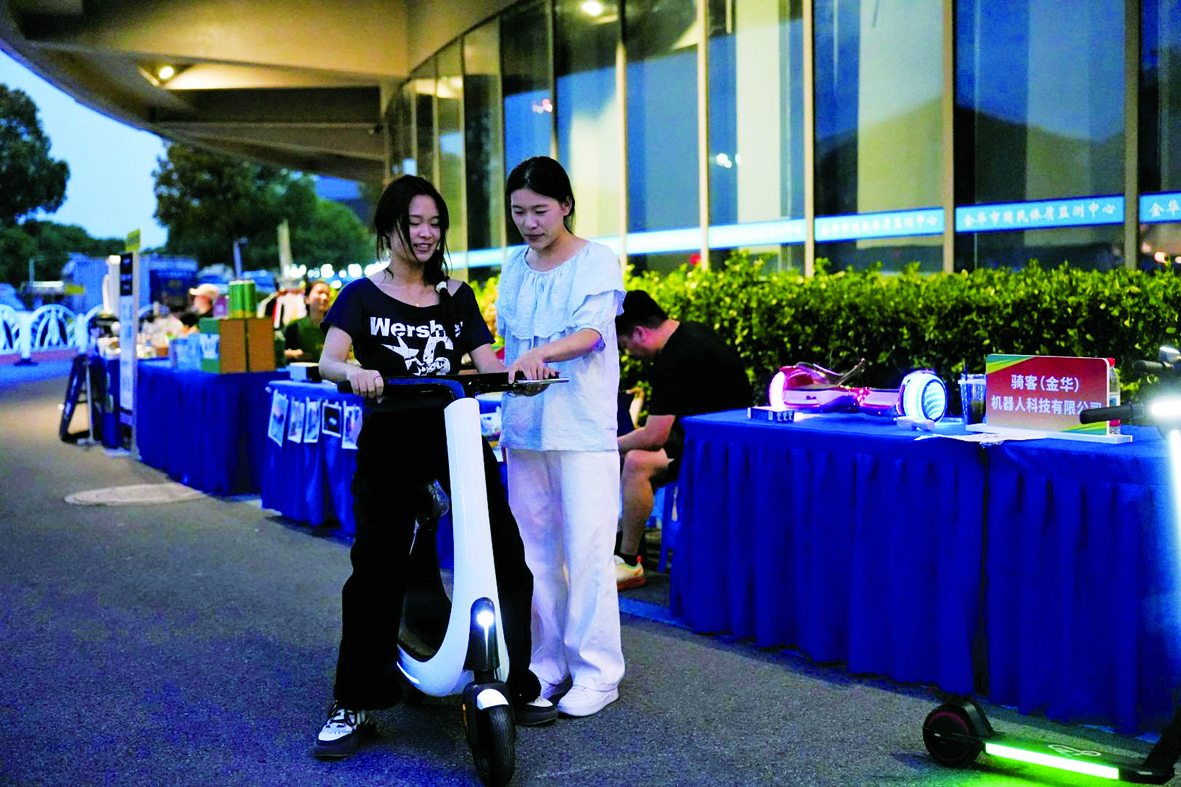 展销现场,金华制造科技元素频频亮相,骑客(金华)机器人科技有限公司带来的平衡车、电动滑板车很受球迷欢迎。“这个怎么卖?可以试骑吗?”“您可以试试,它比一般的电动自行车要轻便。”企业销售人员李薇说,因为场地有限,带来的产品不多,现场不少人加了微信咨询产品售卖详情。