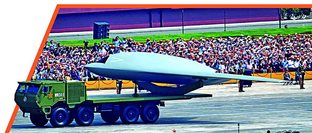 (左上图:高超声速导弹方队接受检阅;右下图:空中无人作战方队接受检阅。新华社发)