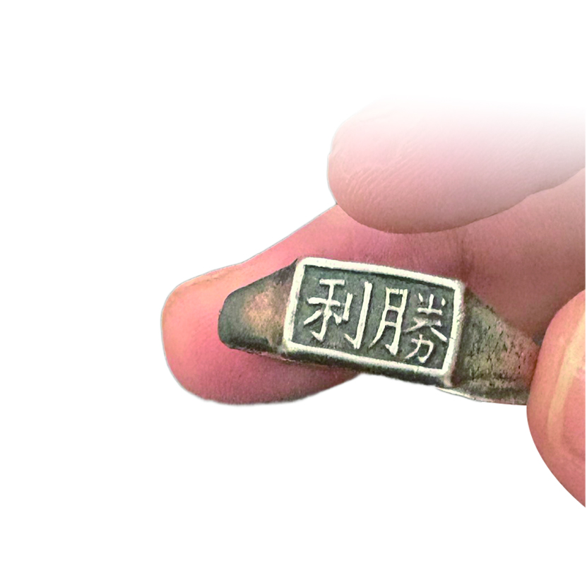 记者见到戒指时,虽表面附着黑色氧化物,却不影响“胜利”二字的辨识度。字体镌刻在长方形戒面中央,笔画规整有力。董柏良将戒指托在掌心:“你看这刻工,线条挺括,肯定是精心定制的,不是批量生产的普通饰品。”他翻到戒面背后,指着磨损的刻痕继续说:“这里原本该有字,可能是人名、日期,可惜年代久了,只剩零星印记,认不出完整内容。”