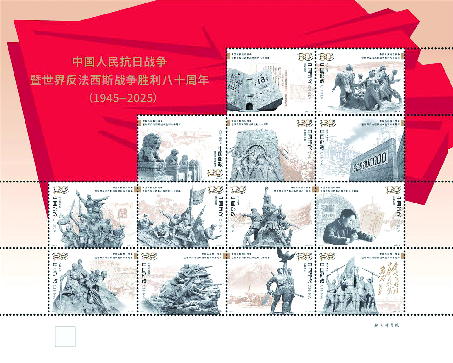 《中国人民抗日战争暨世界反法西斯战争胜利80周年》纪念邮票以14年抗战历程为主线,聚焦重要战役战斗,采用抗战题材雕塑为主要表现形式,搭配历史照片背景创作,兼具历史厚重感与艺术感染力。
