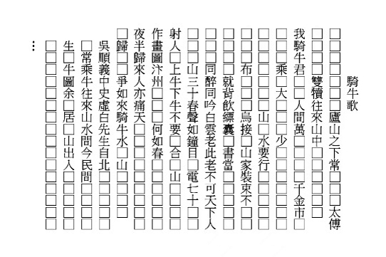 它的整体保存状况实在太差了,风化脱落非常厉害,一眼看过去,几乎识读不出任何内容来。占有四分之一地位的右上部分黝黑一片,中间残存着一些像是云纹的刻画。在它的中间偏上部位,经辨认能识读一些文字,它就是失传已久的《骑牛图诗刻》。