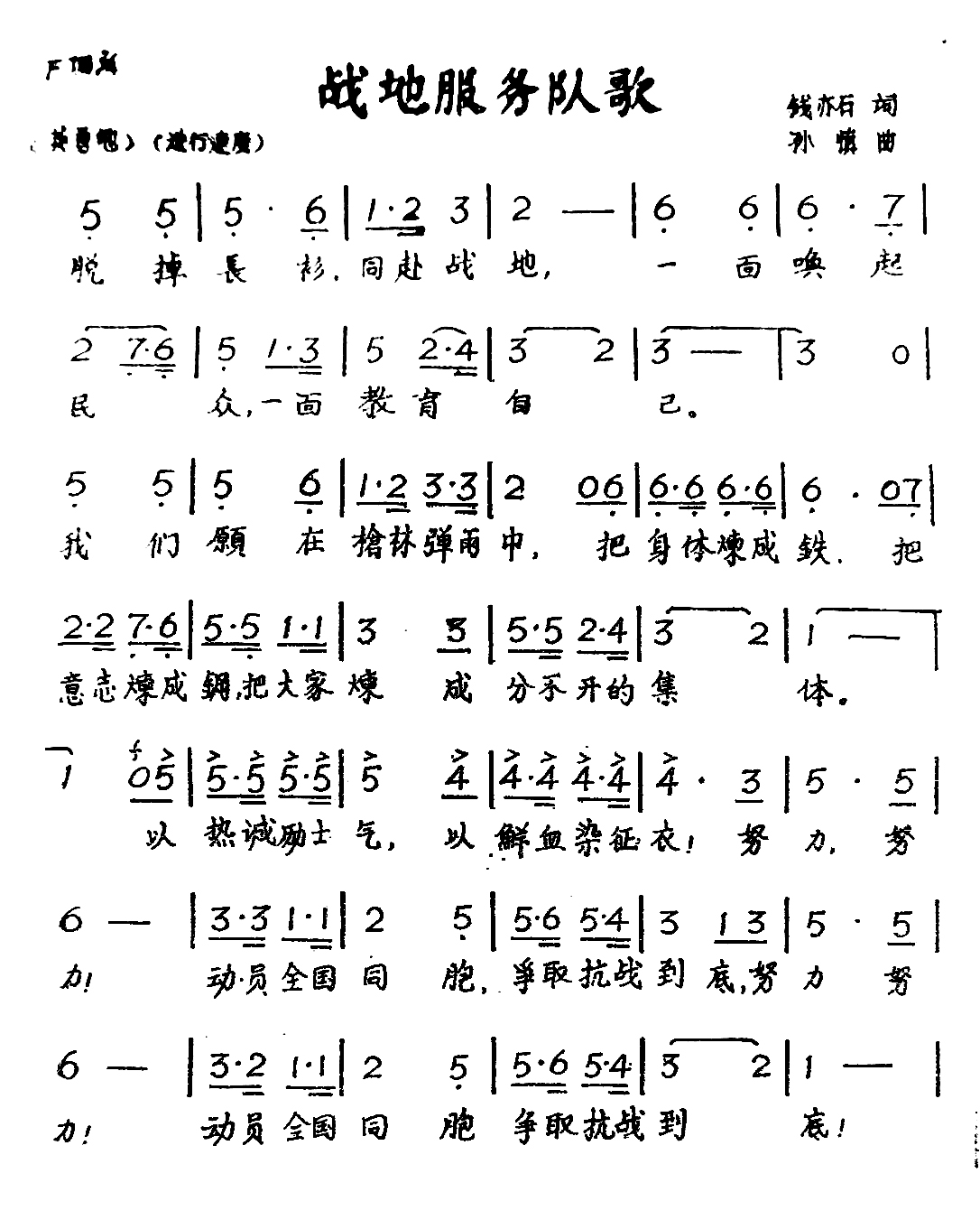 战地服务队成立后,大家开始学唱队歌。队歌由钱亦石填词,孙慎作曲。