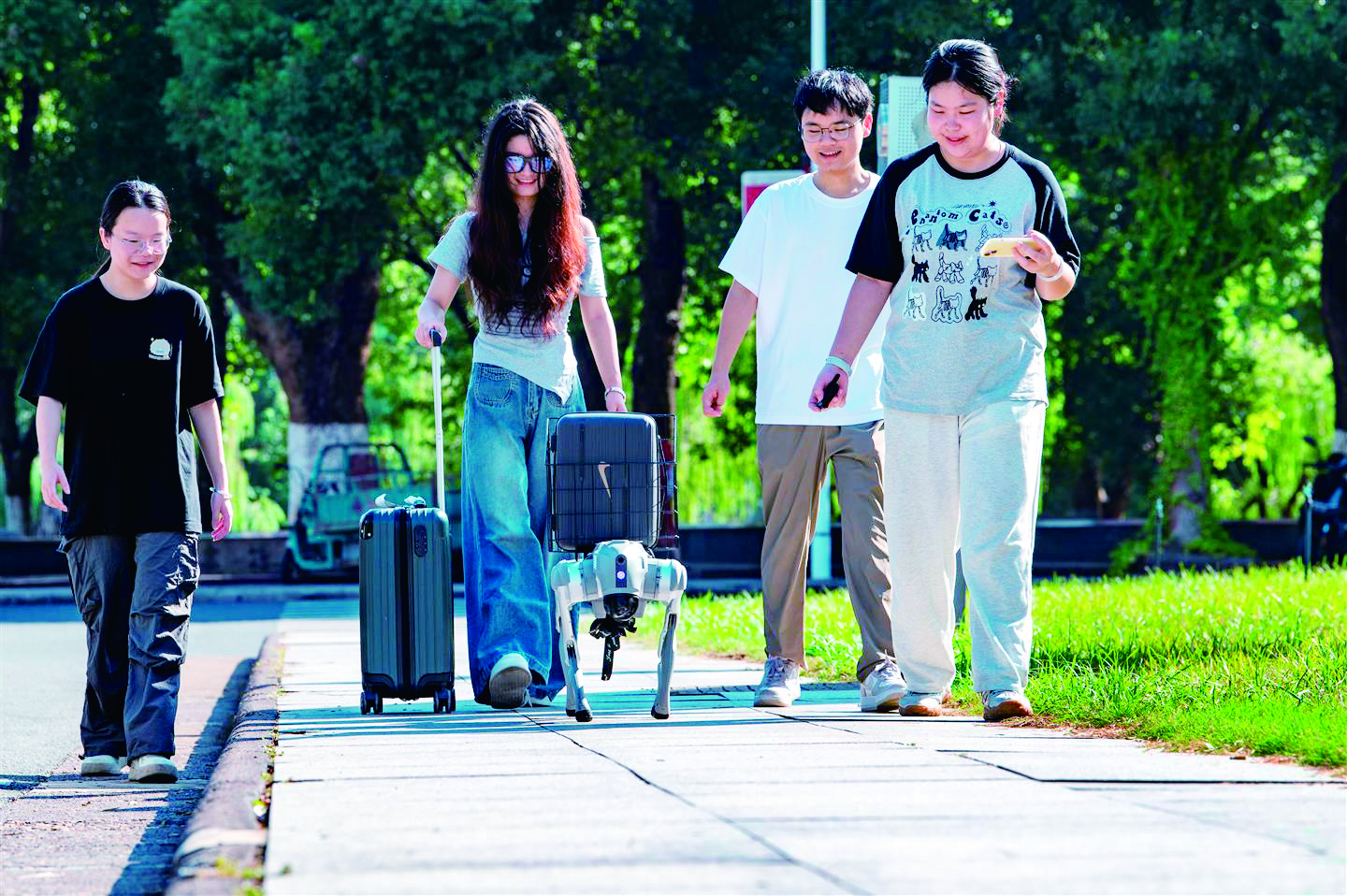 记者 胡肖飞 文/摄 9月8日,金华职业技术大学校园里,一位特殊“志愿者”——宇树机器人变身“行李搬运工”,帮助学生搬运行李,吸引师生好奇的目光。 金华职业技术大学这款宇树机器人用于校园巡逻。据介绍,本次投入机器人迎新服务既是技术实践,也缓解了高温下人工搬运的压力。