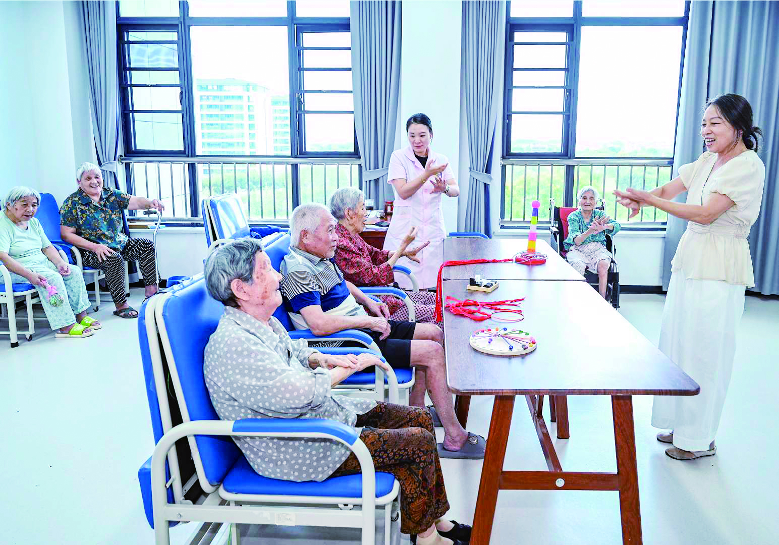 记者 吴潮宏 文/摄 “来,伸出双手,跟着我一起握拳、伸展……”昨天,在婺城区安地镇卫生院医养服务中心活动室,两名护理人员带领老人练习手指操。 据悉,这座集医疗、康复、护理、文娱等功能于一体的“一站式”康养综合体,运营半年多来,用实际行动守护“夕阳红”的幸福时光,获得入住老人及家属的广泛好评。