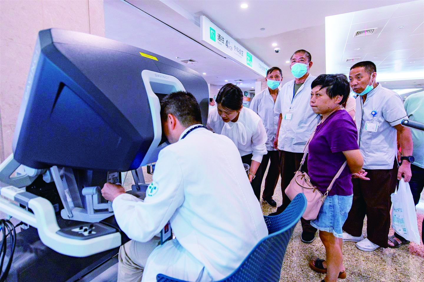 9月8日,市中心医院门诊大厅,一些市民和医务人员纷纷坐上达芬奇手术机器人“驾驶舱”,体验“主刀手术”。