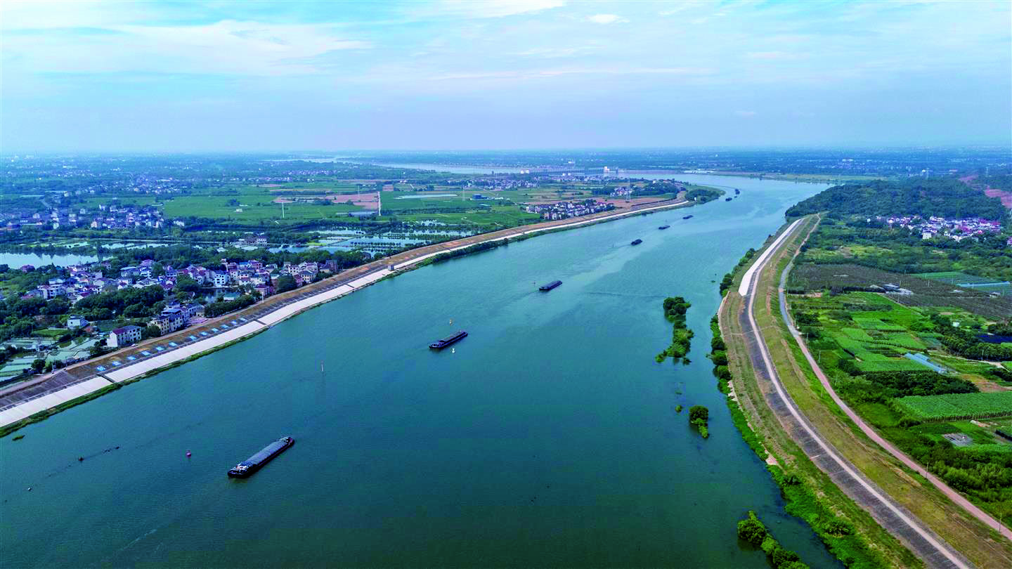 9月9日,兰溪市衢江两岸,万亩良田绿意盎然,与衢江航道上航行的货轮相映成景,构成一幅秀美的田园画卷(无人机照片)。